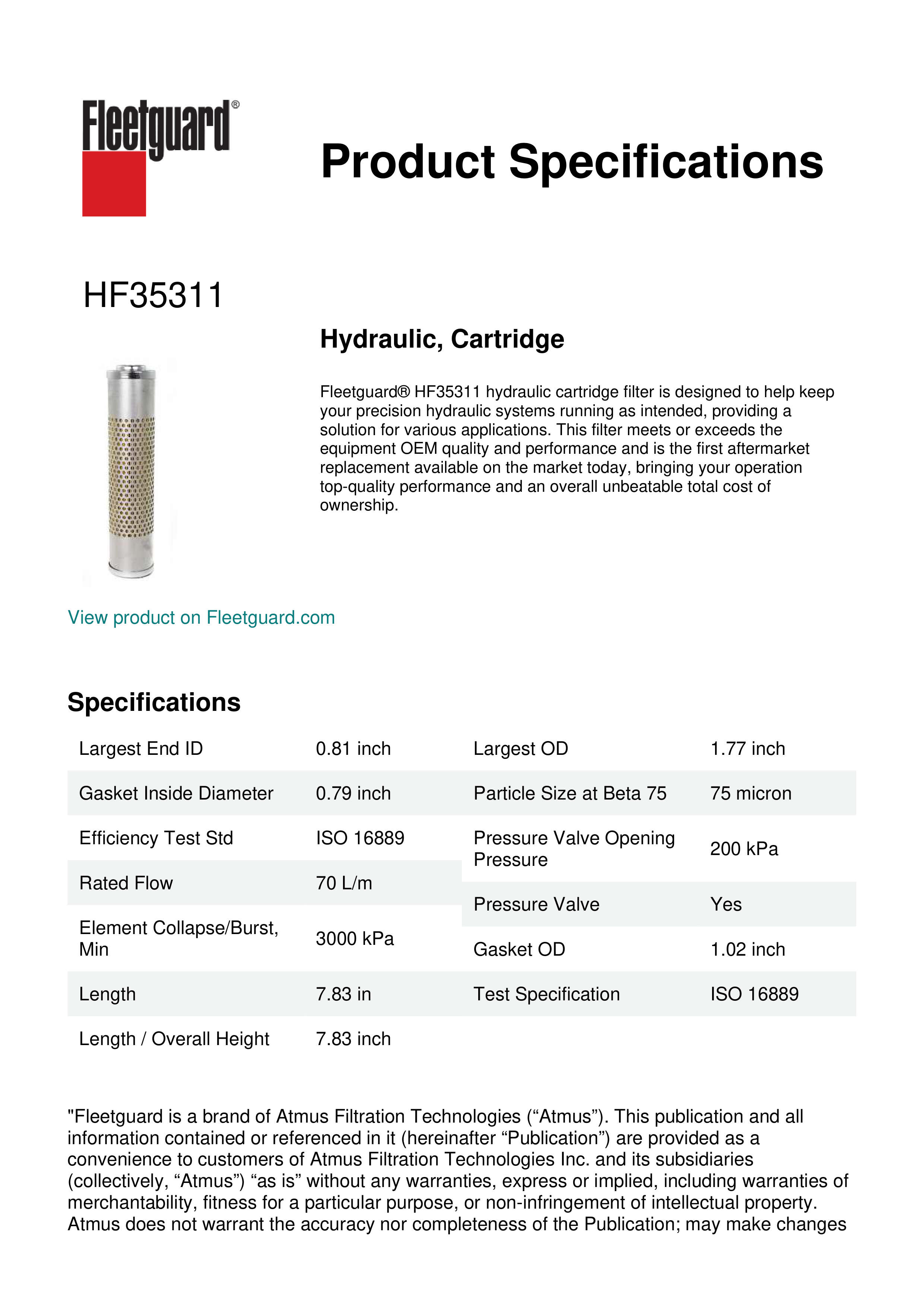 Fleetguard® HF35311 hydraulic cartridge filter is designed to help keep your precision hydraulic systems running as intended, providing a solution for various applications. This filter meets or exceeds the equipment OEM quality and performance and is the first aftermarket replacement available on the market today, bringing your operation top-quality performance and an overall unbeatable total cost of ownership.Specification