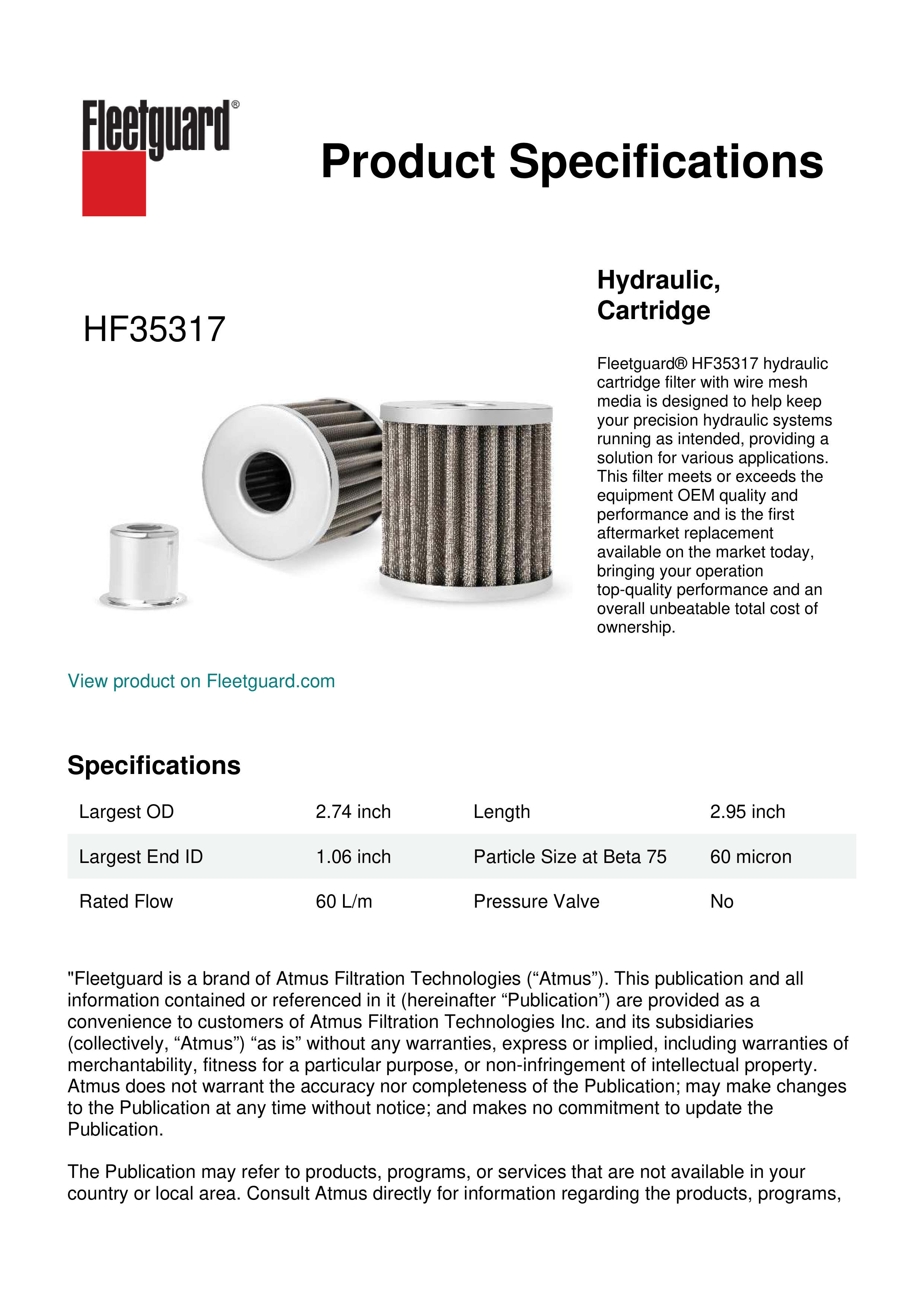 Fleetguard® HF35317 hydraulic cartridge filter with wire mesh media is designed to help keep your precision hydraulic systems running as intended, providing a solution for various applications. This filter meets or exceeds the equipment OEM quality and performance and is the first aftermarket replacement available on the market today, bringing your operation top-quality performance and an overall unbeatable total cost of ownership.Specification