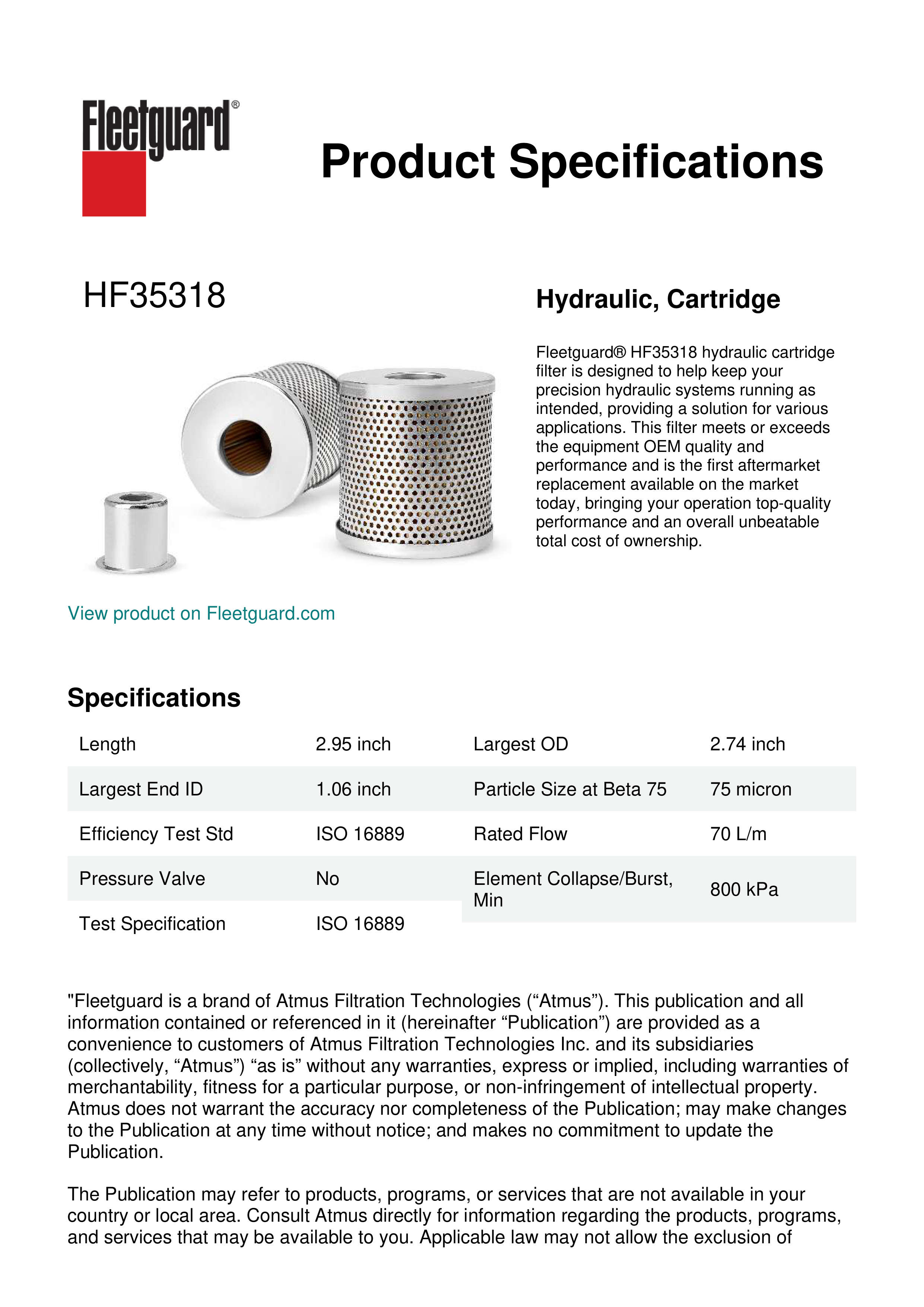 Fleetguard® HF35318 hydraulic cartridge filter is designed to help keep your precision hydraulic systems running as intended, providing a solution for various applications. This filter meets or exceeds the equipment OEM quality and performance and is the first aftermarket replacement available on the market today, bringing your operation top-quality performance and an overall unbeatable total cost of ownership.Specification