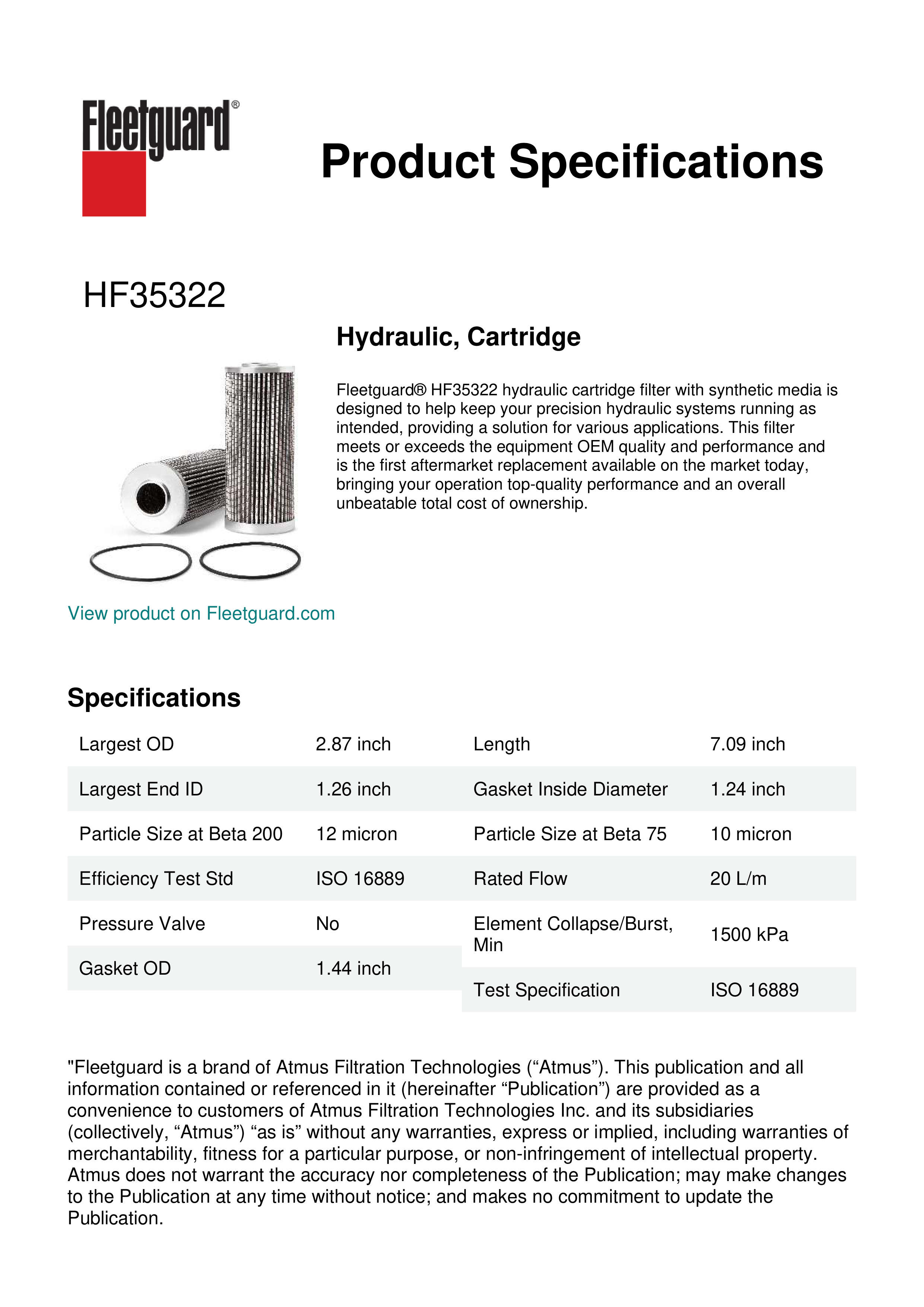 Fleetguard® HF35322 hydraulic cartridge filter with synthetic media is designed to help keep your precision hydraulic systems running as intended, providing a solution for various applications. This filter meets or exceeds the equipment OEM quality and performance and is the first aftermarket replacement available on the market today, bringing your operation top-quality performance and an overall unbeatable total cost of ownership.Specification