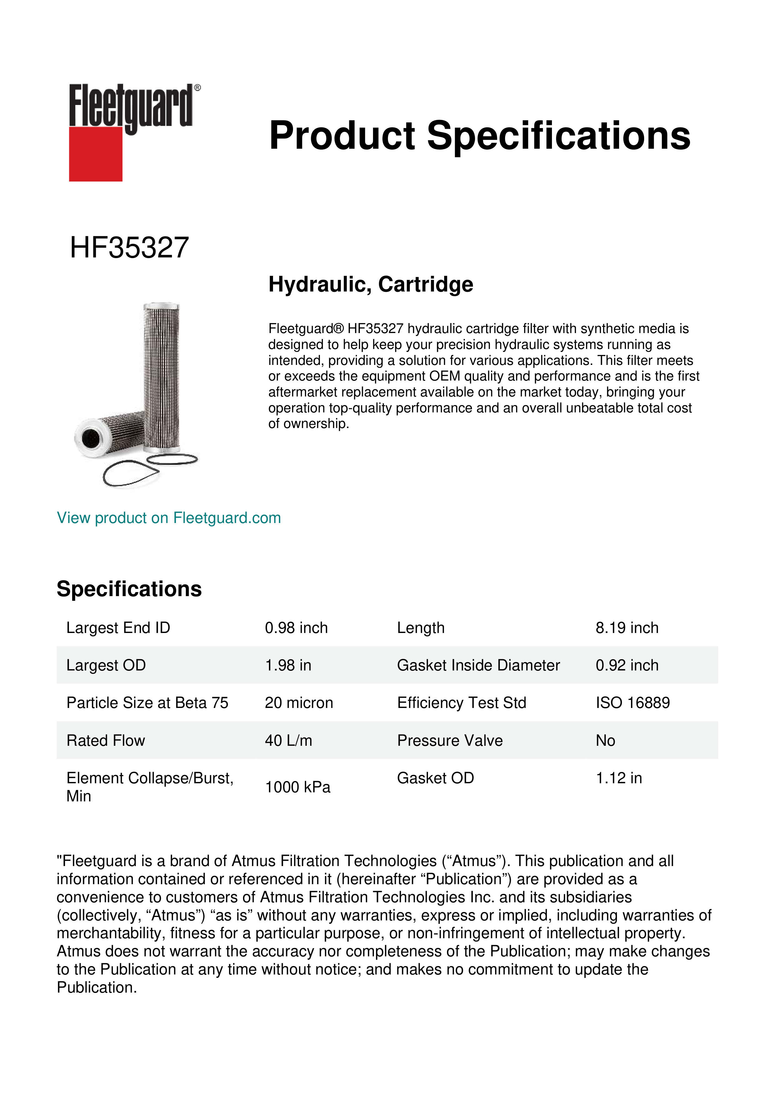 Fleetguard® HF35327 hydraulic cartridge filter with synthetic media is designed to help keep your precision hydraulic systems running as intended, providing a solution for various applications. This filter meets or exceeds the equipment OEM quality and performance and is the first aftermarket replacement available on the market today, bringing your operation top-quality performance and an overall unbeatable total cost of ownership.Specification