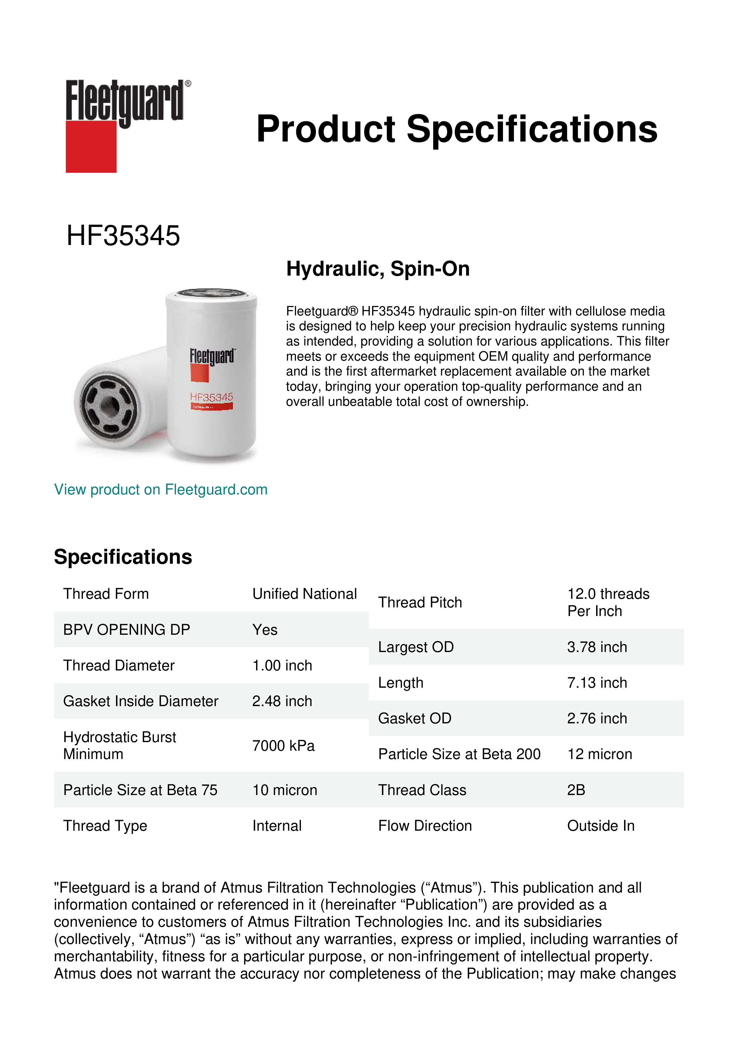 Fleetguard® HF35345 hydraulic spin-on filter with cellulose media is designed to help keep your precision hydraulic systems running as intended, providing a solution for various applications. This filter meets or exceeds the equipment OEM quality and performance and is the first aftermarket replacement available on the market today, bringing your operation top-quality performance and an overall unbeatable total cost of ownership.Specification