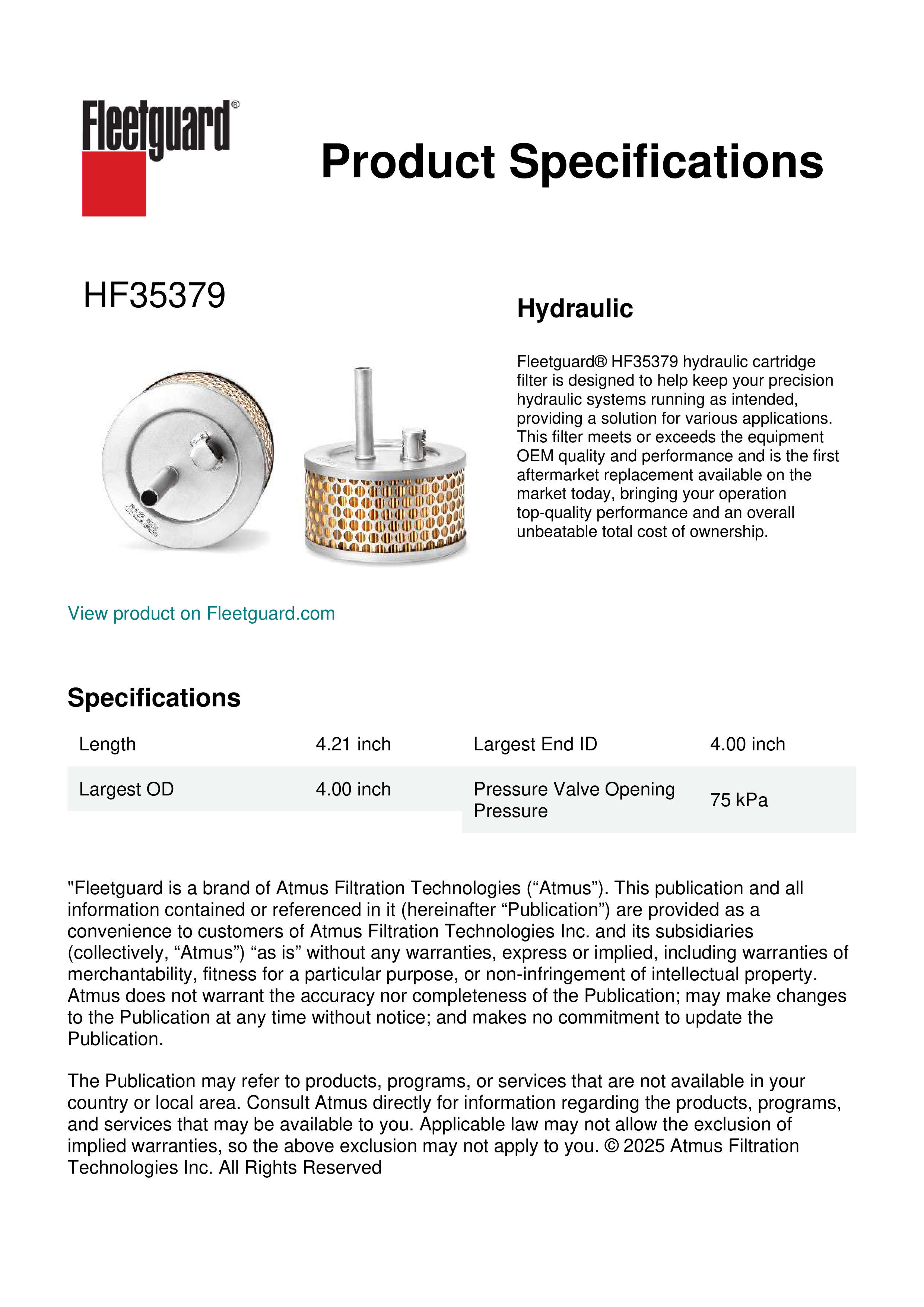 Fleetguard® HF35379 hydraulic cartridge filter is designed to help keep your precision hydraulic systems running as intended, providing a solution for various applications. This filter meets or exceeds the equipment OEM quality and performance and is the first aftermarket replacement available on the market today, bringing your operation top-quality performance and an overall unbeatable total cost of ownership.Specification