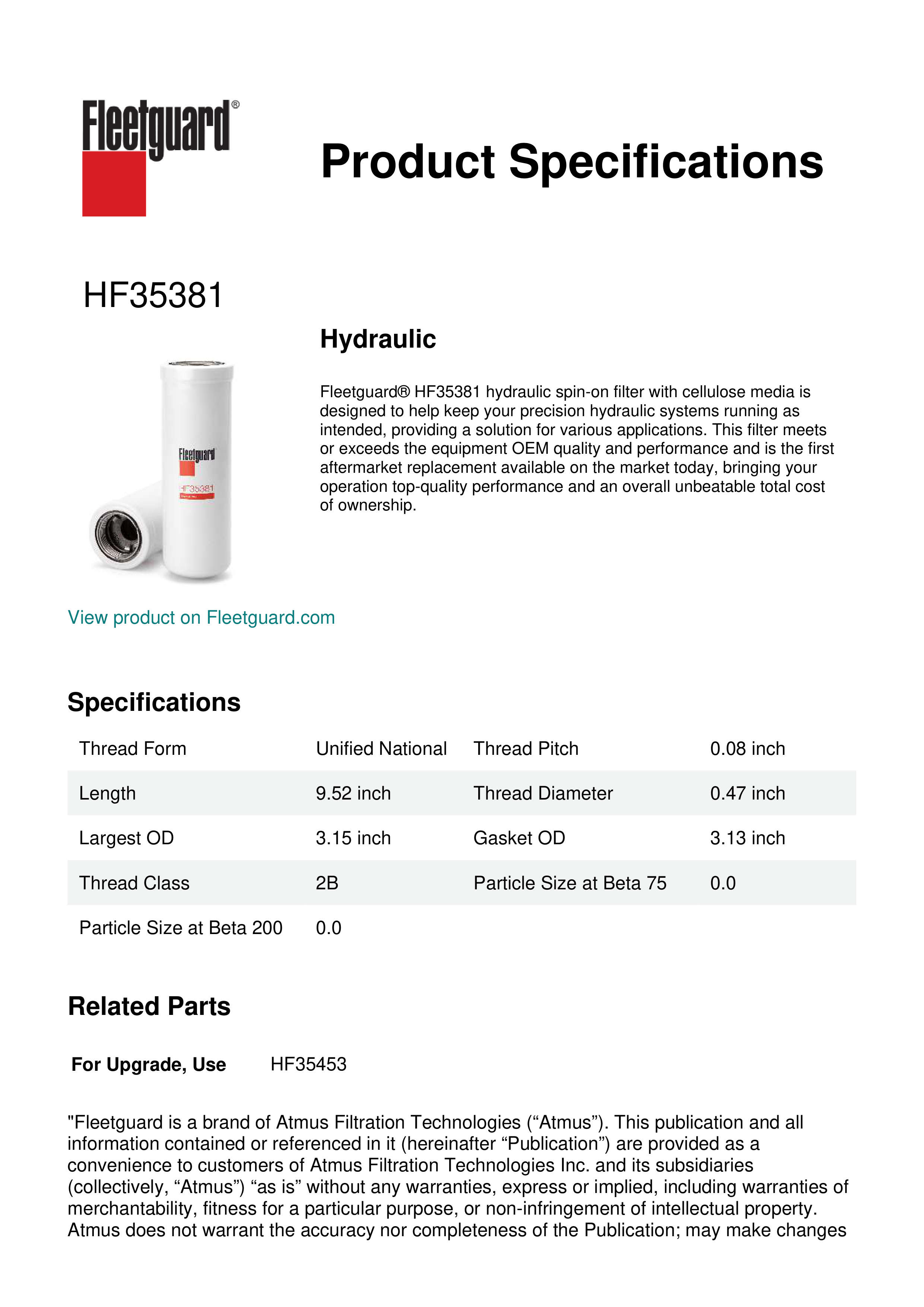 Fleetguard® HF35381 hydraulic spin-on filter with cellulose media is designed to help keep your precision hydraulic systems running as intended, providing a solution for various applications. This filter meets or exceeds the equipment OEM quality and performance and is the first aftermarket replacement available on the market today, bringing your operation top-quality performance and an overall unbeatable total cost of ownership.Specification