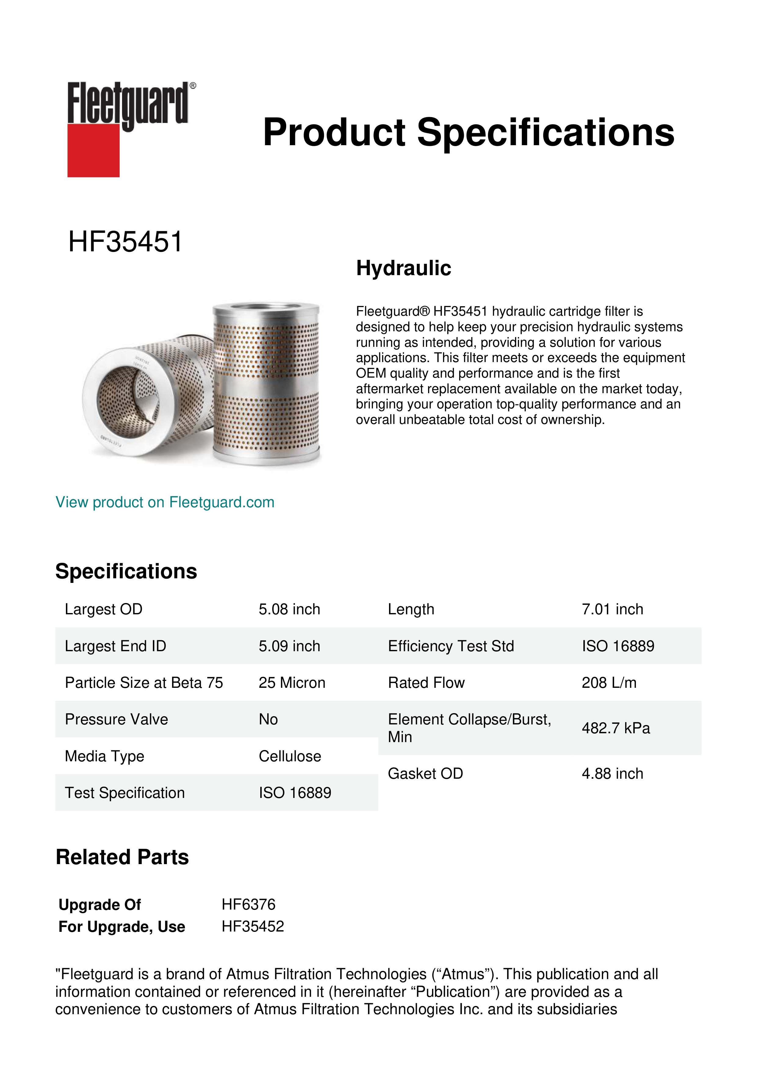 Fleetguard® HF35451 hydraulic cartridge filter is designed to help keep your precision hydraulic systems running as intended, providing a solution for various applications. This filter meets or exceeds the equipment OEM quality and performance and is the first aftermarket replacement available on the market today, bringing your operation top-quality performance and an overall unbeatable total cost of ownership.Specification