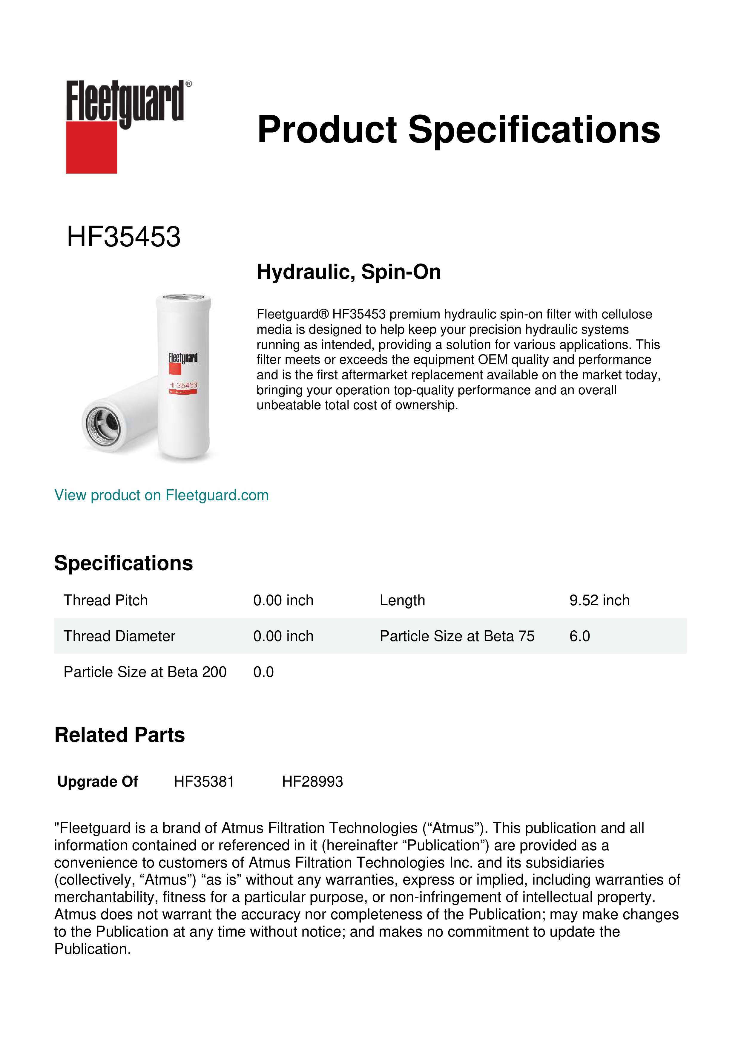 Fleetguard® HF35453 premium hydraulic spin-on filter with cellulose media is designed to help keep your precision hydraulic systems running as intended, providing a solution for various applications. This filter meets or exceeds the equipment OEM quality and performance and is the first aftermarket replacement available on the market today, bringing your operation top-quality performance and an overall unbeatable total cost of ownership.Specification