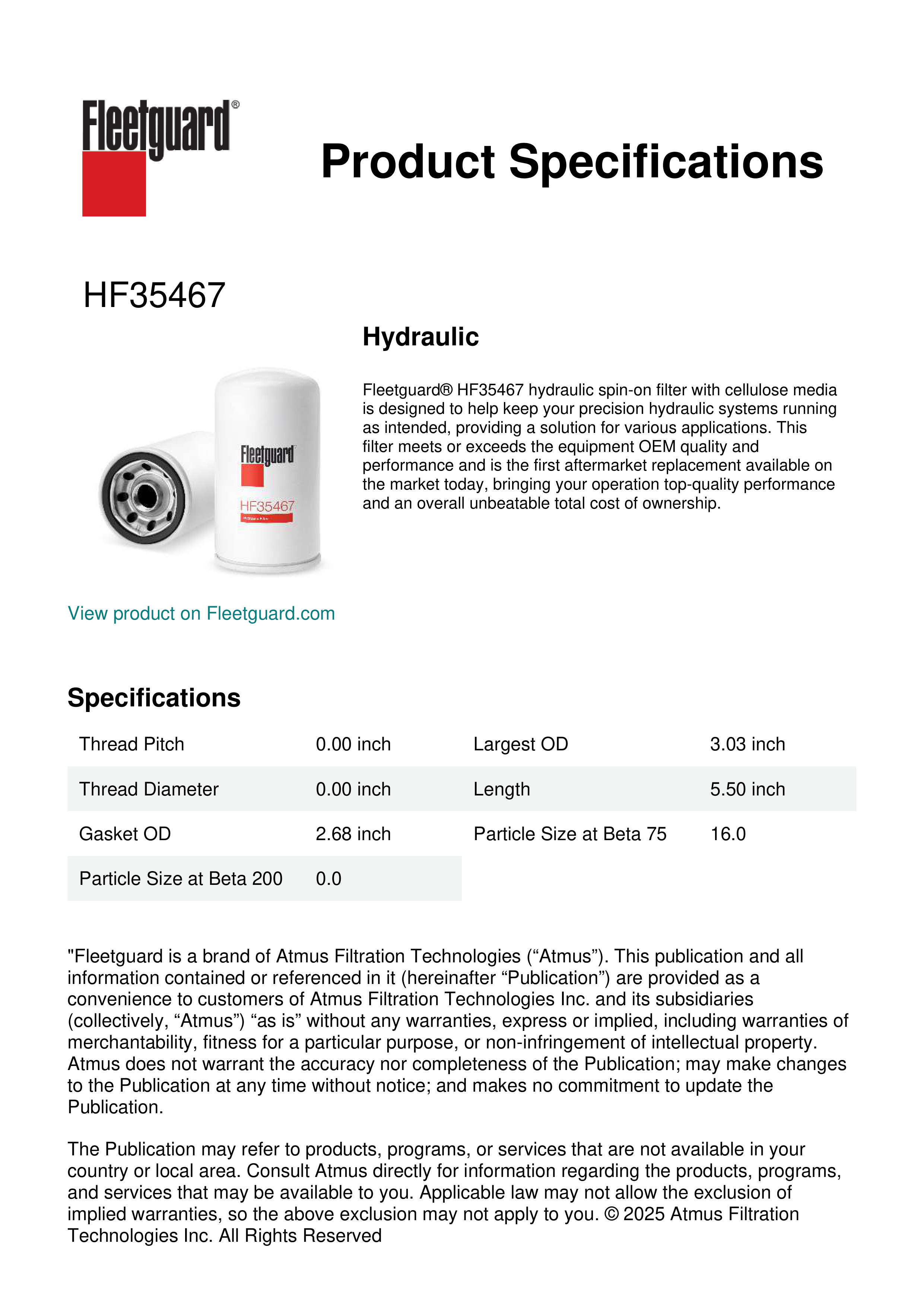 Fleetguard® HF35467 hydraulic spin-on filter with cellulose media is designed to help keep your precision hydraulic systems running as intended, providing a solution for various applications. This filter meets or exceeds the equipment OEM quality and performance and is the first aftermarket replacement available on the market today, bringing your operation top-quality performance and an overall unbeatable total cost of ownership.Specification