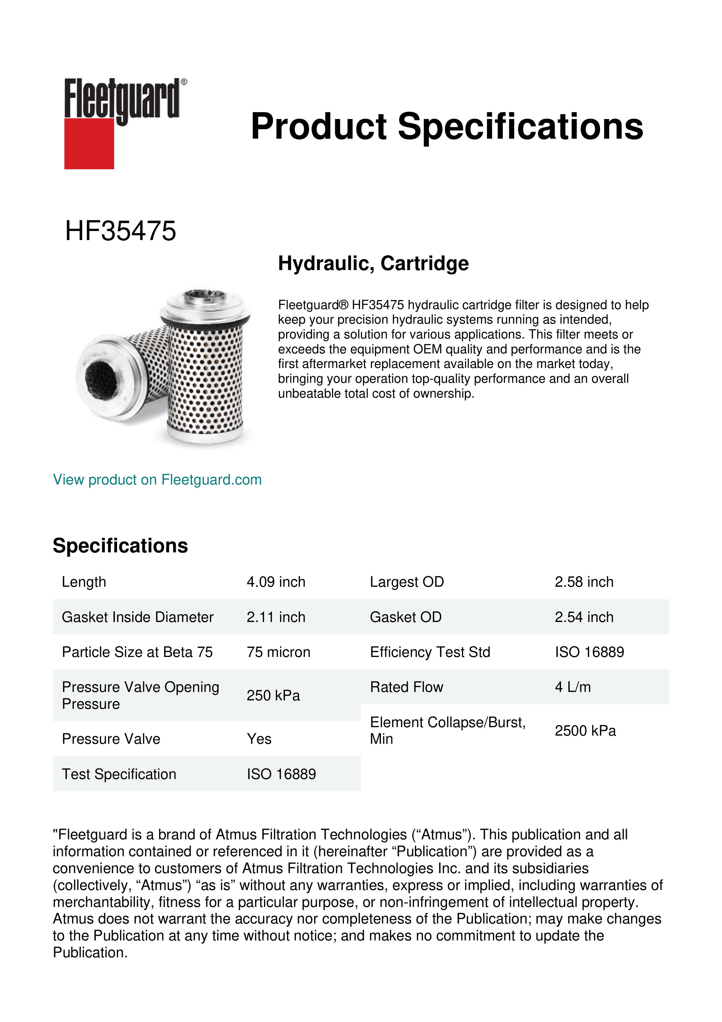 Fleetguard® HF35475 spin-on lube filter meets or exceeds OE performance requirements and the new challenges of modern engine technology.Specification