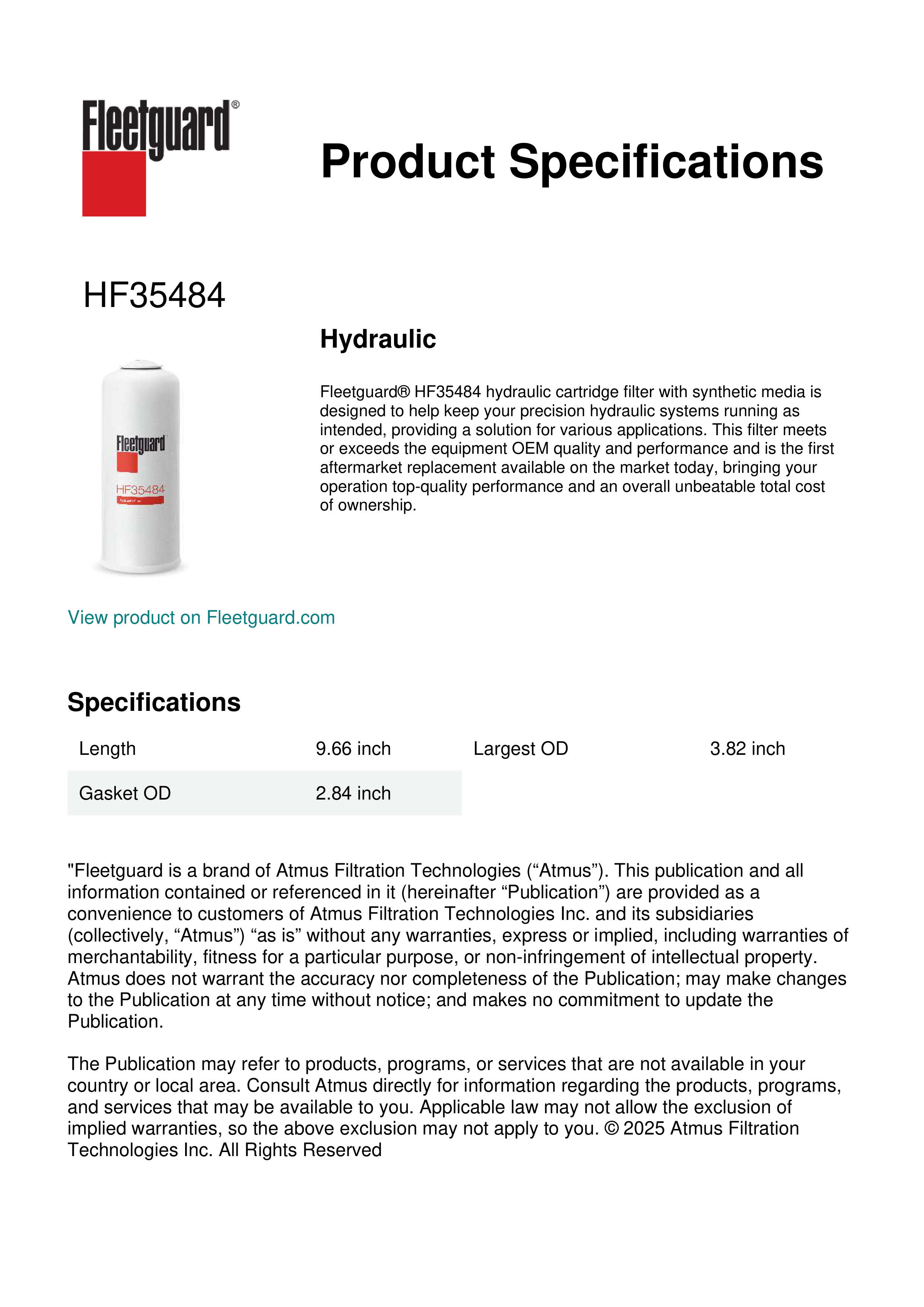 Fleetguard® HF35484 hydraulic cartridge filter with synthetic media is designed to help keep your precision hydraulic systems running as intended, providing a solution for various applications. This filter meets or exceeds the equipment OEM quality and performance and is the first aftermarket replacement available on the market today, bringing your operation top-quality performance and an overall unbeatable total cost of ownership.Specification