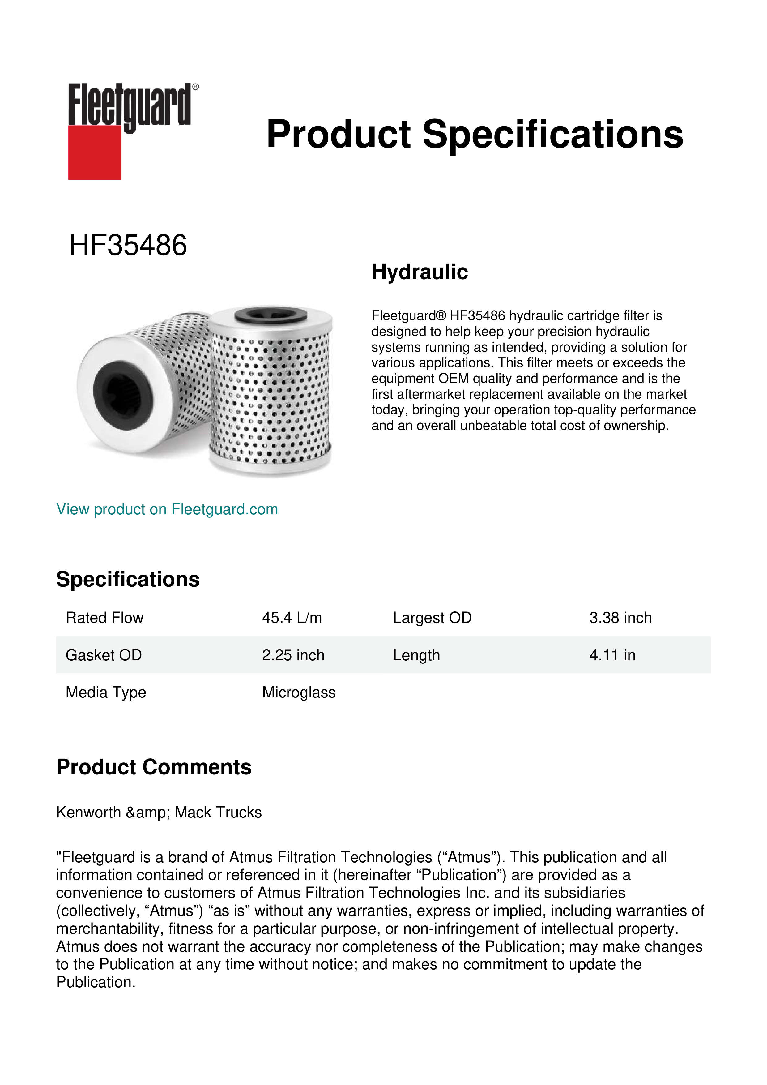 Fleetguard® HF35486 hydraulic cartridge filter is designed to help keep your precision hydraulic systems running as intended, providing a solution for various applications. This filter meets or exceeds the equipment OEM quality and performance and is the first aftermarket replacement available on the market today, bringing your operation top-quality performance and an overall unbeatable total cost of ownership.Specification