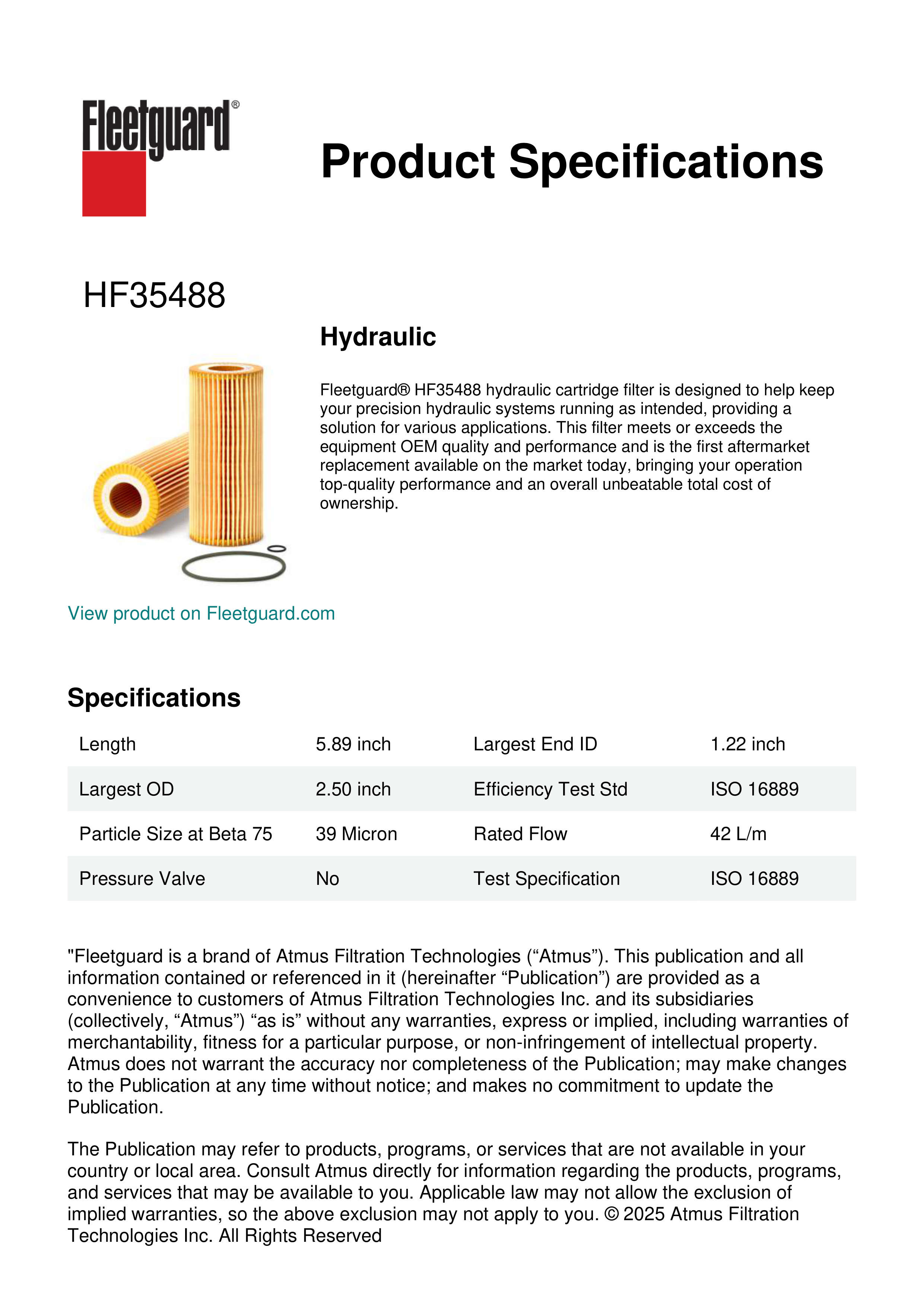 Fleetguard® HF35488 hydraulic cartridge filter is designed to help keep your precision hydraulic systems running as intended, providing a solution for various applications. This filter meets or exceeds the equipment OEM quality and performance and is the first aftermarket replacement available on the market today, bringing your operation top-quality performance and an overall unbeatable total cost of ownership.Specification