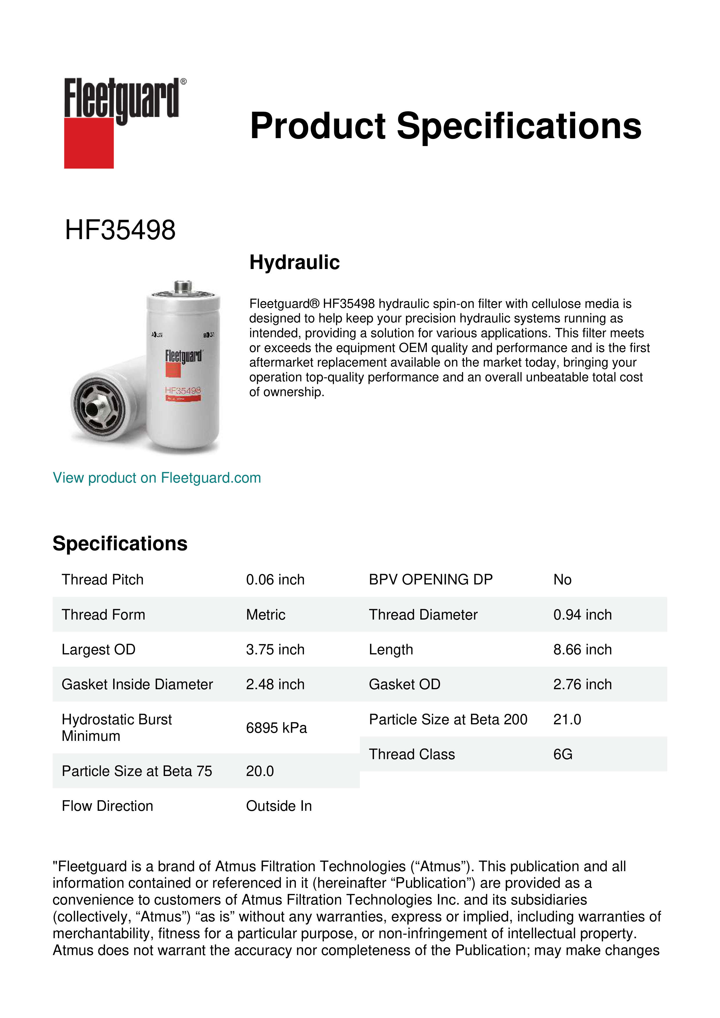 Fleetguard® HF35498 hydraulic spin-on filter with cellulose media is designed to help keep your precision hydraulic systems running as intended, providing a solution for various applications. This filter meets or exceeds the equipment OEM quality and performance and is the first aftermarket replacement available on the market today, bringing your operation top-quality performance and an overall unbeatable total cost of ownership.Specification