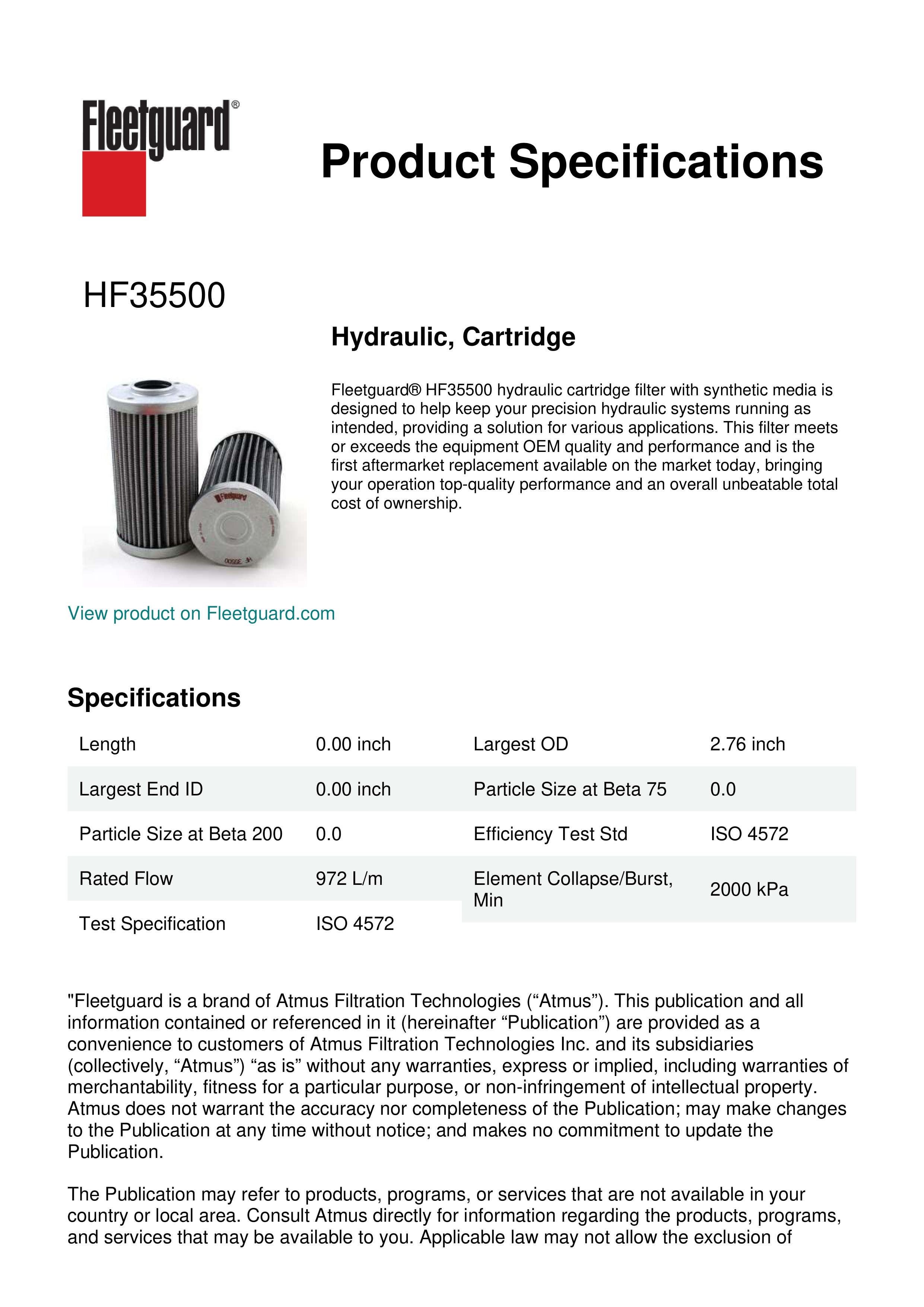 Fleetguard® HF35500 hydraulic cartridge filter with synthetic media is designed to help keep your precision hydraulic systems running as intended, providing a solution for various applications. This filter meets or exceeds the equipment OEM quality and performance and is the first aftermarket replacement available on the market today, bringing your operation top-quality performance and an overall unbeatable total cost of ownership.Specification