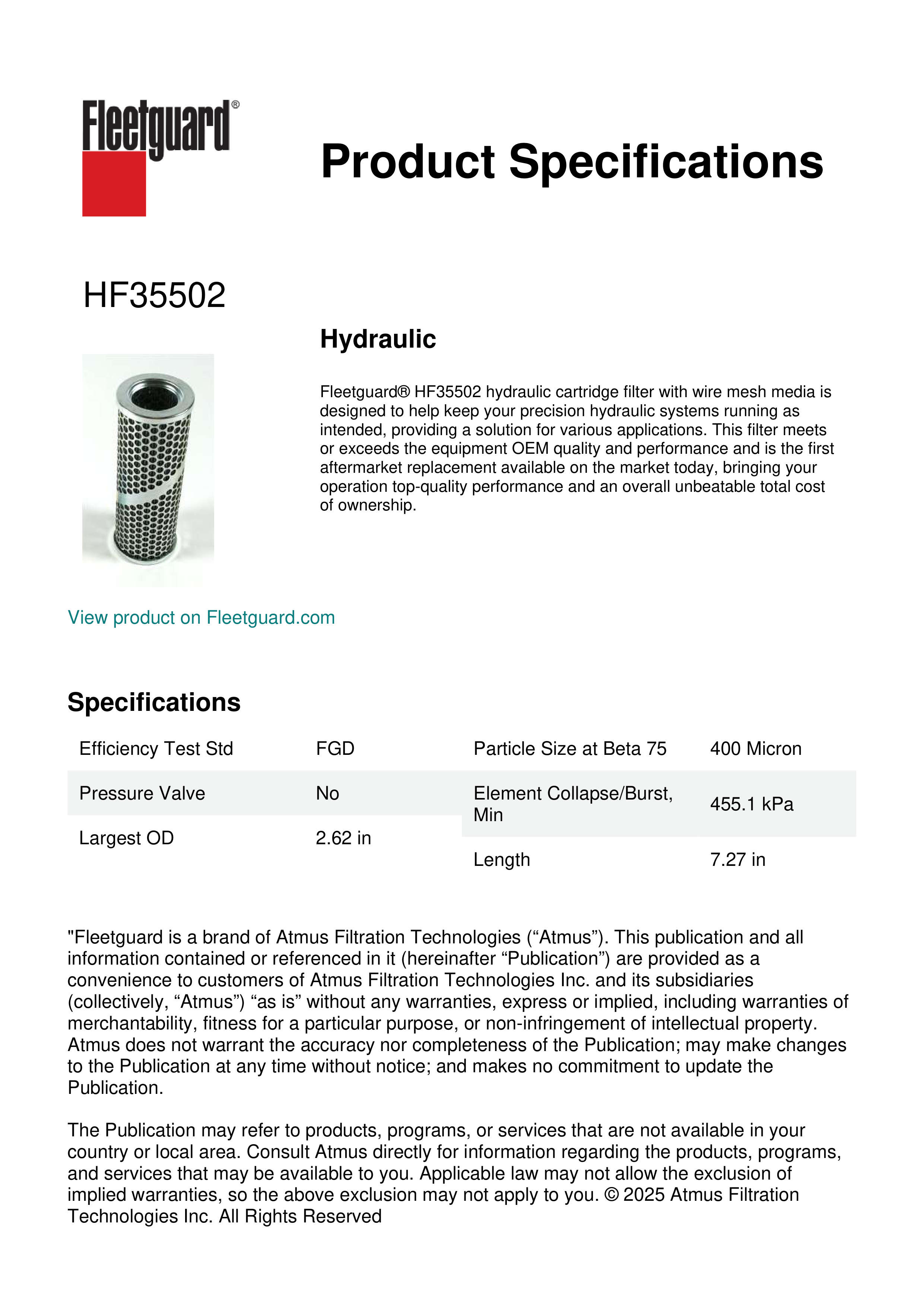 Fleetguard® HF35502 hydraulic cartridge filter with wire mesh media is designed to help keep your precision hydraulic systems running as intended, providing a solution for various applications. This filter meets or exceeds the equipment OEM quality and performance and is the first aftermarket replacement available on the market today, bringing your operation top-quality performance and an overall unbeatable total cost of ownership.Specification
