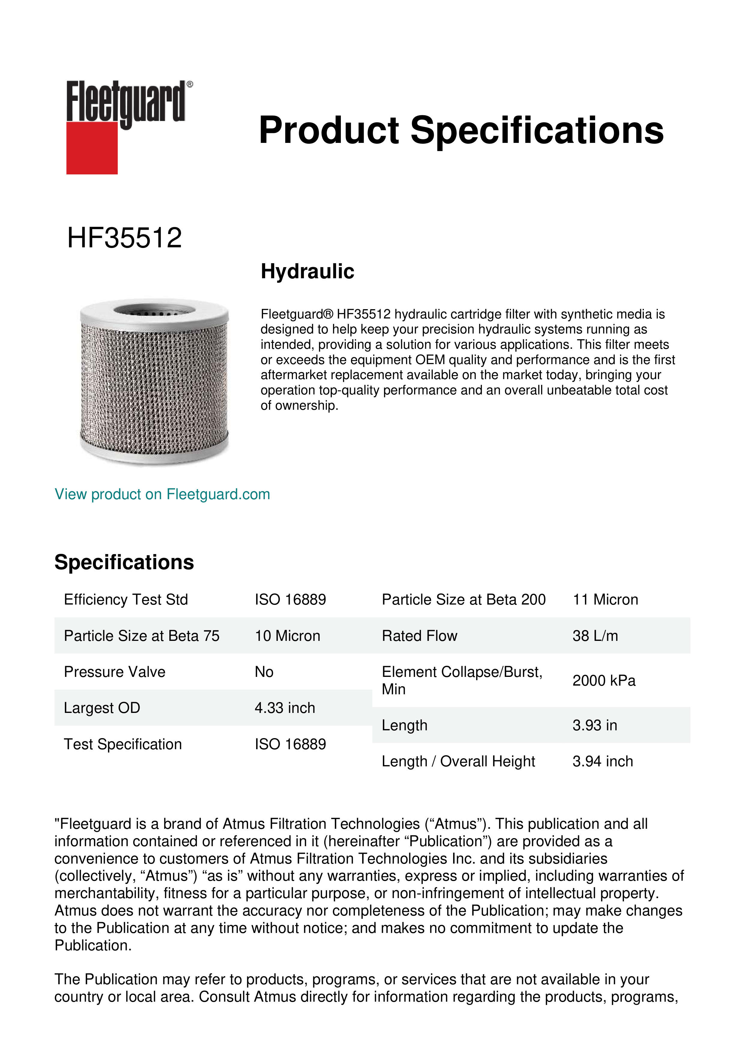 Fleetguard® HF35512 hydraulic cartridge filter with synthetic media is designed to help keep your precision hydraulic systems running as intended, providing a solution for various applications. This filter meets or exceeds the equipment OEM quality and performance and is the first aftermarket replacement available on the market today, bringing your operation top-quality performance and an overall unbeatable total cost of ownership.Specification