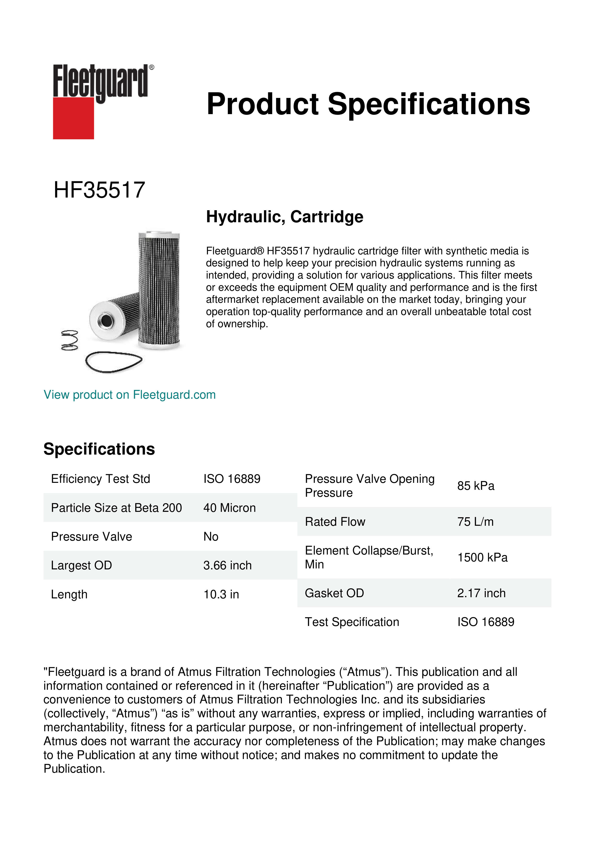 Fleetguard® HF35517 hydraulic cartridge filter with synthetic media is designed to help keep your precision hydraulic systems running as intended, providing a solution for various applications. This filter meets or exceeds the equipment OEM quality and performance and is the first aftermarket replacement available on the market today, bringing your operation top-quality performance and an overall unbeatable total cost of ownership.Specification