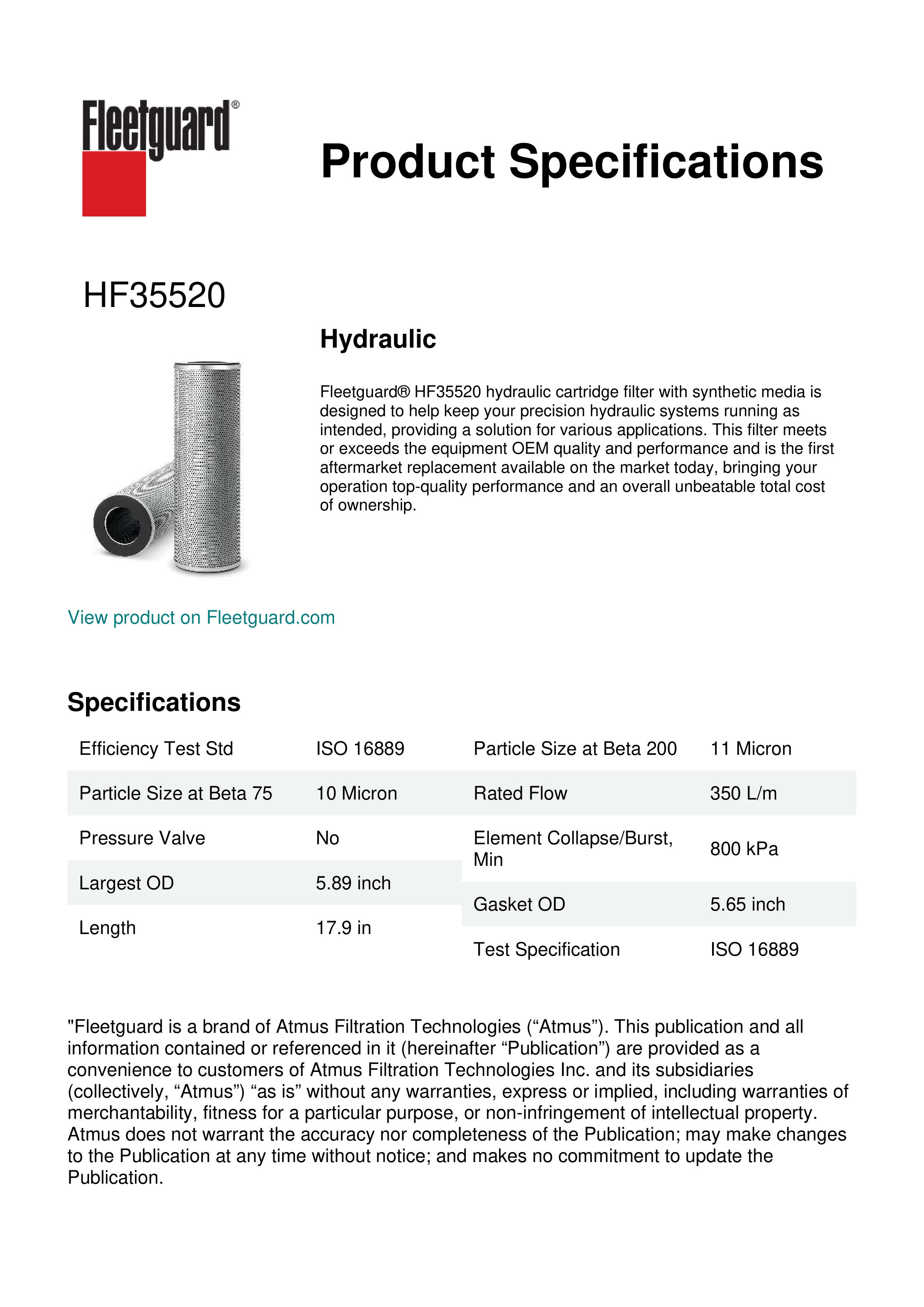 Fleetguard® HF35520 hydraulic cartridge filter with synthetic media is designed to help keep your precision hydraulic systems running as intended, providing a solution for various applications. This filter meets or exceeds the equipment OEM quality and performance and is the first aftermarket replacement available on the market today, bringing your operation top-quality performance and an overall unbeatable total cost of ownership.Specification