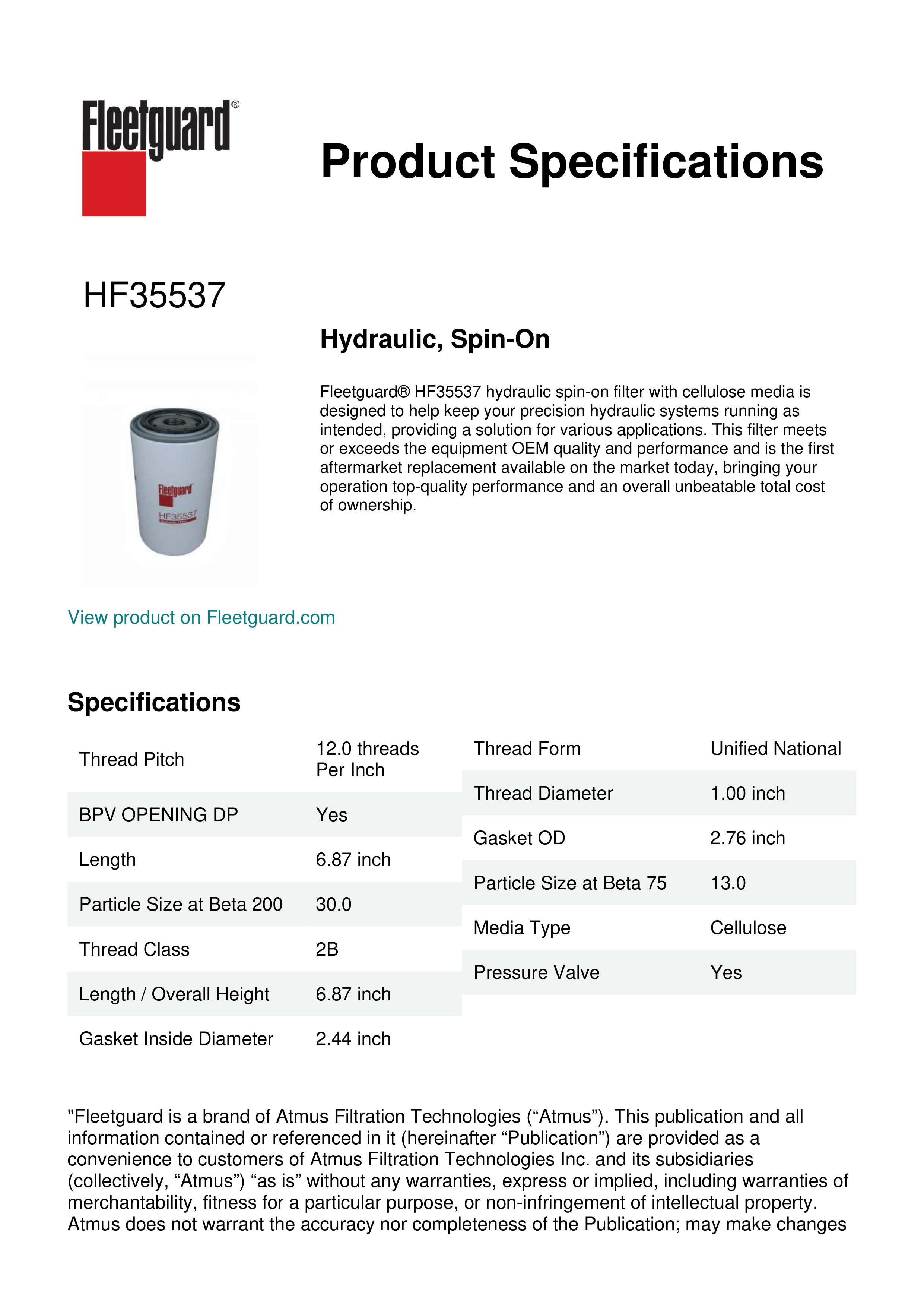 Fleetguard® HF35537 hydraulic spin-on filter with cellulose media is designed to help keep your precision hydraulic systems running as intended, providing a solution for various applications. This filter meets or exceeds the equipment OEM quality and performance and is the first aftermarket replacement available on the market today, bringing your operation top-quality performance and an overall unbeatable total cost of ownership.Specification