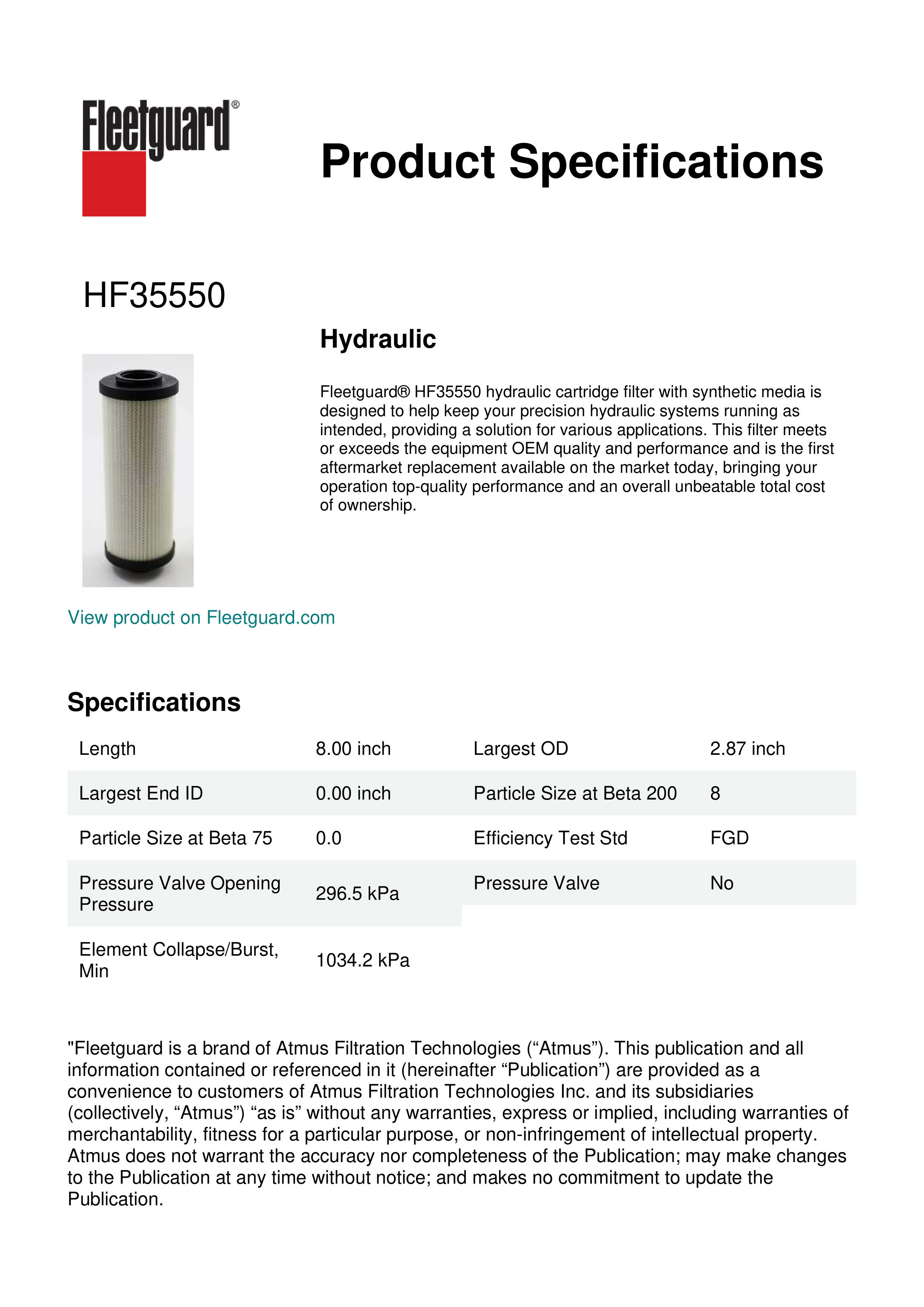 Fleetguard® HF35550 hydraulic cartridge filter with synthetic media is designed to help keep your precision hydraulic systems running as intended, providing a solution for various applications. This filter meets or exceeds the equipment OEM quality and performance and is the first aftermarket replacement available on the market today, bringing your operation top-quality performance and an overall unbeatable total cost of ownership.Specification