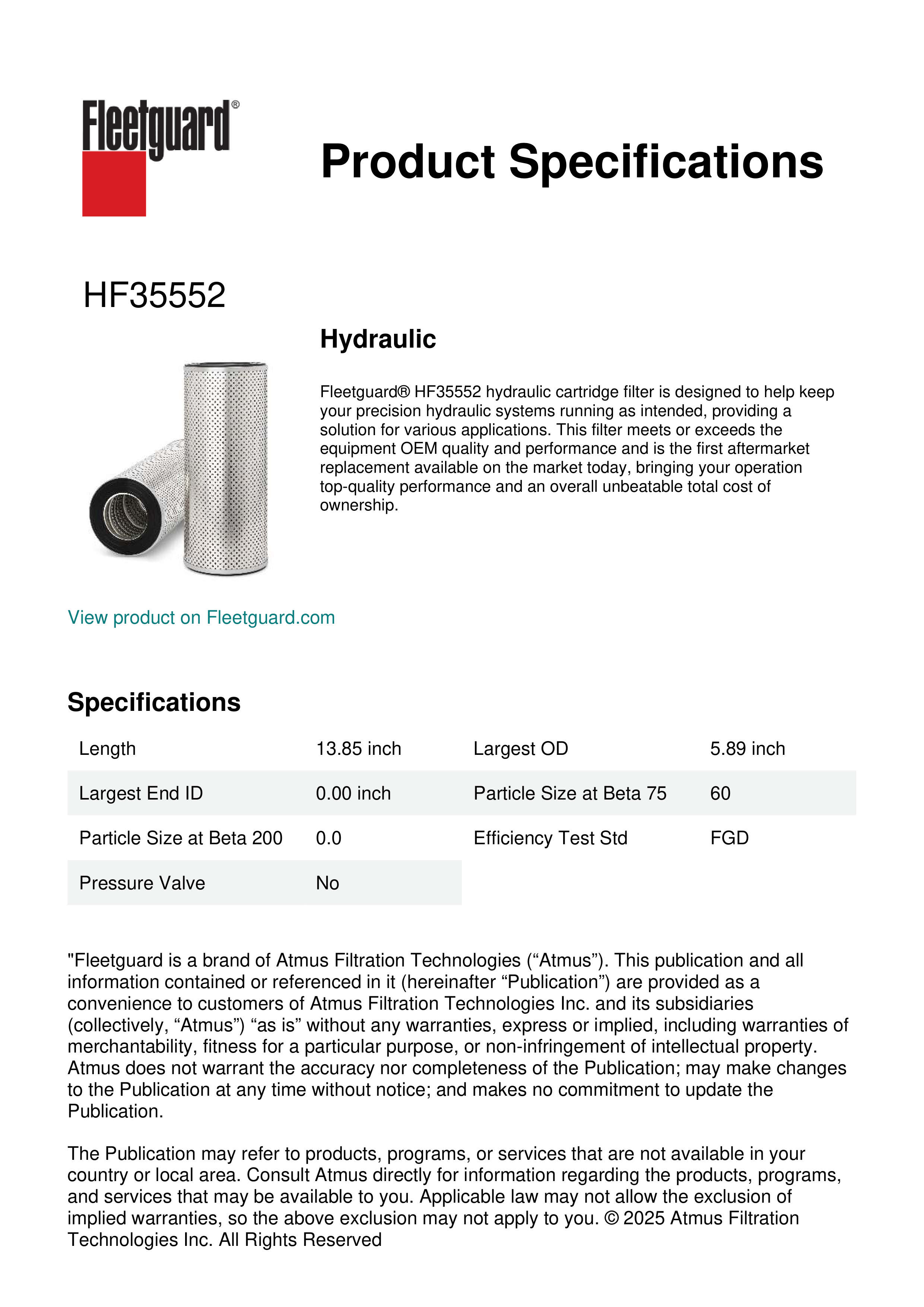 Fleetguard® HF35552 hydraulic cartridge filter is designed to help keep your precision hydraulic systems running as intended, providing a solution for various applications. This filter meets or exceeds the equipment OEM quality and performance and is the first aftermarket replacement available on the market today, bringing your operation top-quality performance and an overall unbeatable total cost of ownership.Specification