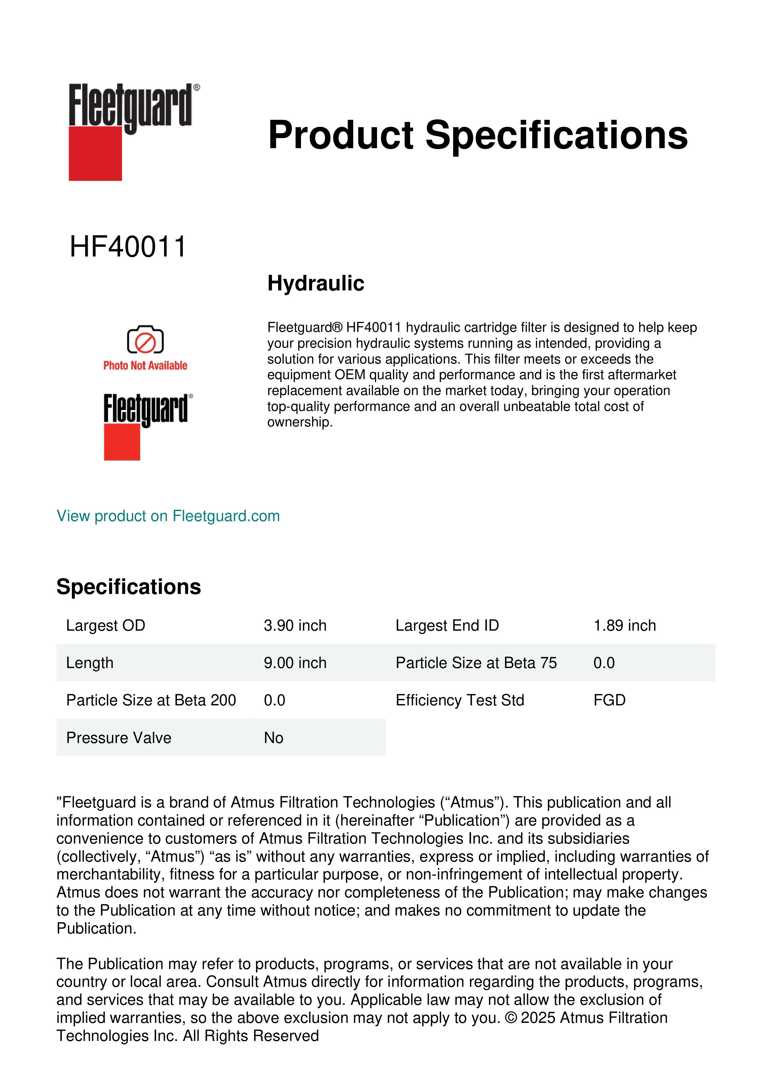 Fleetguard® HF40011 hydraulic cartridge filter is designed to help keep your precision hydraulic systems running as intended, providing a solution for various applications. This filter meets or exceeds the equipment OEM quality and performance and is the first aftermarket replacement available on the market today, bringing your operation top-quality performance and an overall unbeatable total cost of ownership.Specification