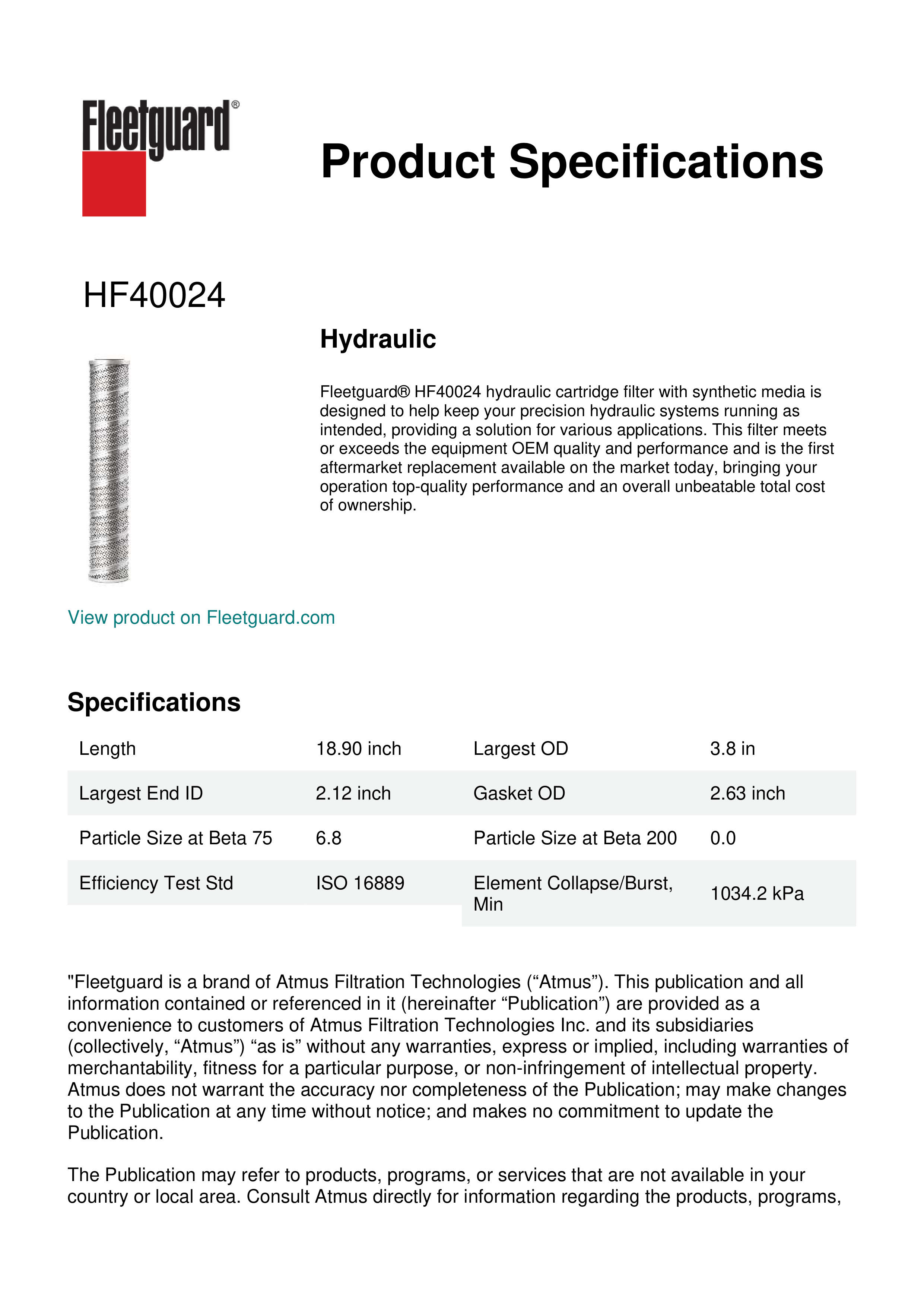 Fleetguard® HF40024 hydraulic cartridge filter with synthetic media is designed to help keep your precision hydraulic systems running as intended, providing a solution for various applications. This filter meets or exceeds the equipment OEM quality and performance and is the first aftermarket replacement available on the market today, bringing your operation top-quality performance and an overall unbeatable total cost of ownership.Specification