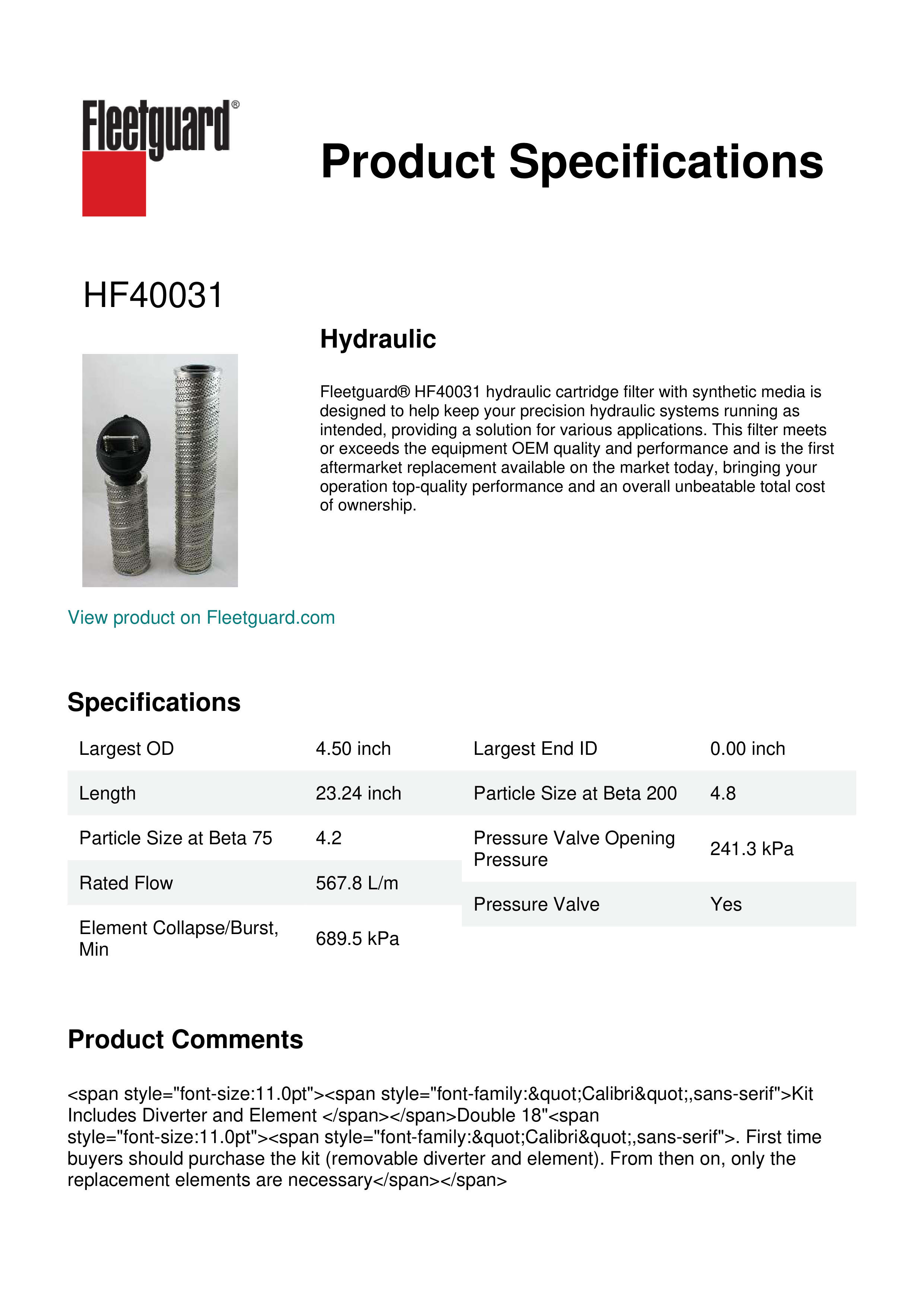 Fleetguard HF40031 Hydraulic Filters
