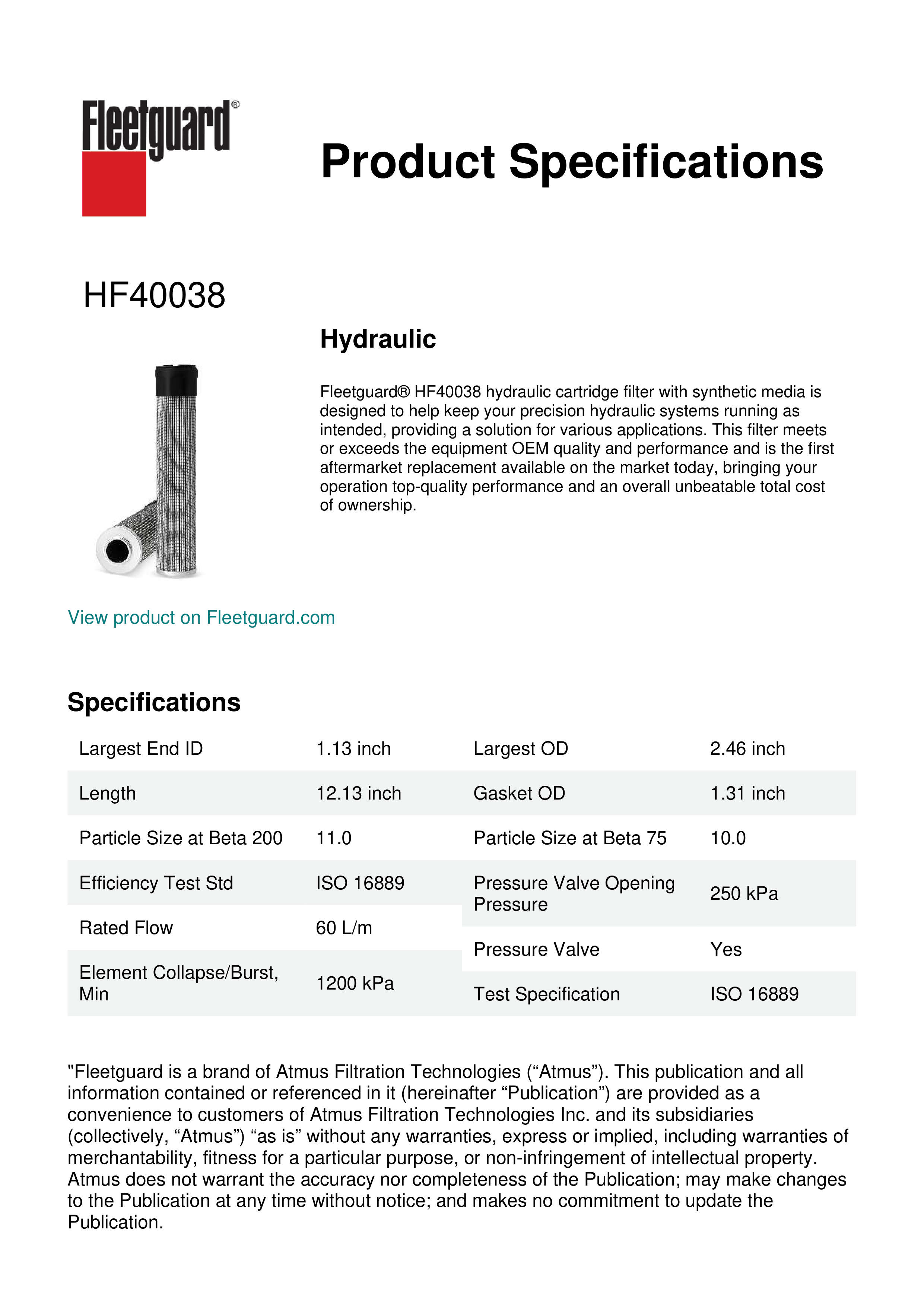 Fleetguard® HF40038 hydraulic cartridge filter with synthetic media is designed to help keep your precision hydraulic systems running as intended, providing a solution for various applications. This filter meets or exceeds the equipment OEM quality and performance and is the first aftermarket replacement available on the market today, bringing your operation top-quality performance and an overall unbeatable total cost of ownership.Specification