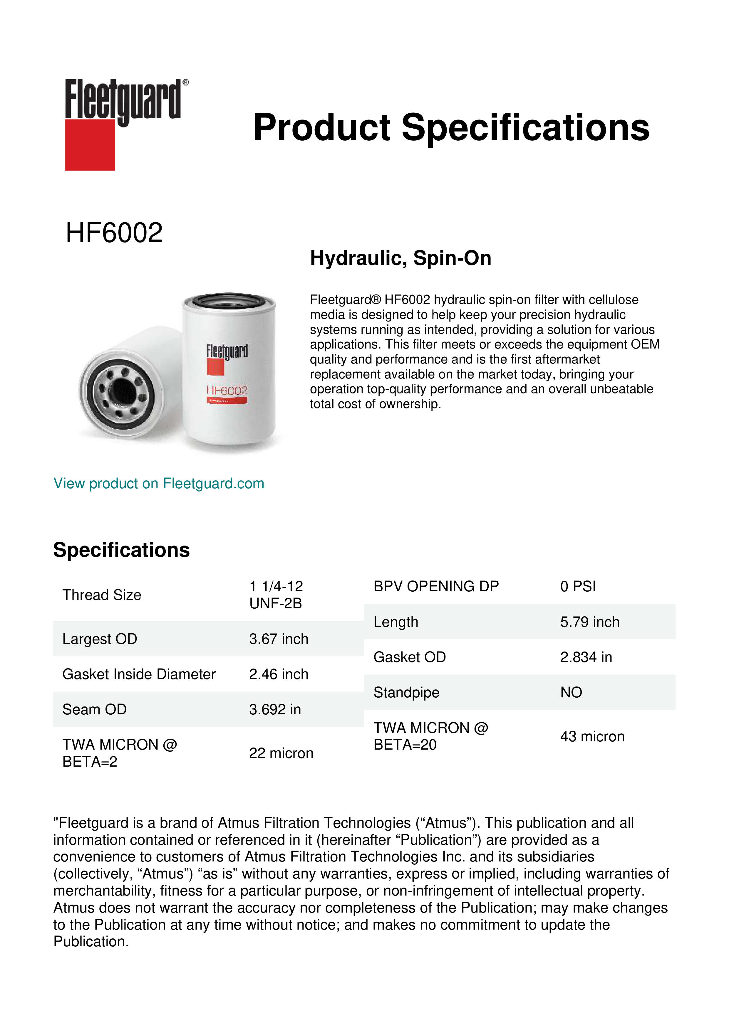 Fleetguard® HF6002 hydraulic spin-on filter with cellulose media is designed to help keep your precision hydraulic systems running as intended, providing a solution for various applications. This filter meets or exceeds the equipment OEM quality and performance and is the first aftermarket replacement available on the market today, bringing your operation top-quality performance and an overall unbeatable total cost of ownership.Specification