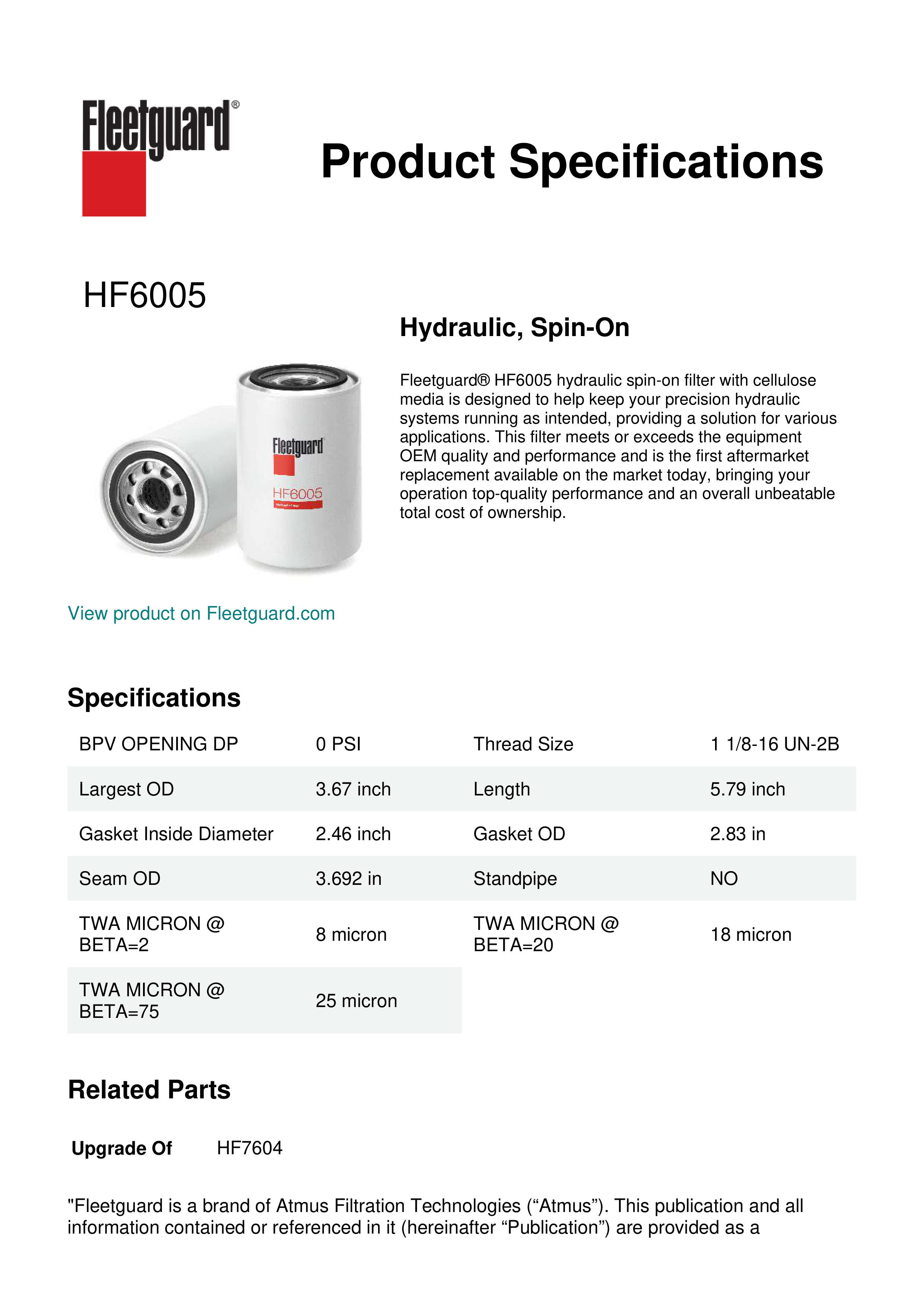 Fleetguard® HF6005 hydraulic spin-on filter with cellulose media is designed to help keep your precision hydraulic systems running as intended, providing a solution for various applications. This filter meets or exceeds the equipment OEM quality and performance and is the first aftermarket replacement available on the market today, bringing your operation top-quality performance and an overall unbeatable total cost of ownership.Specification
