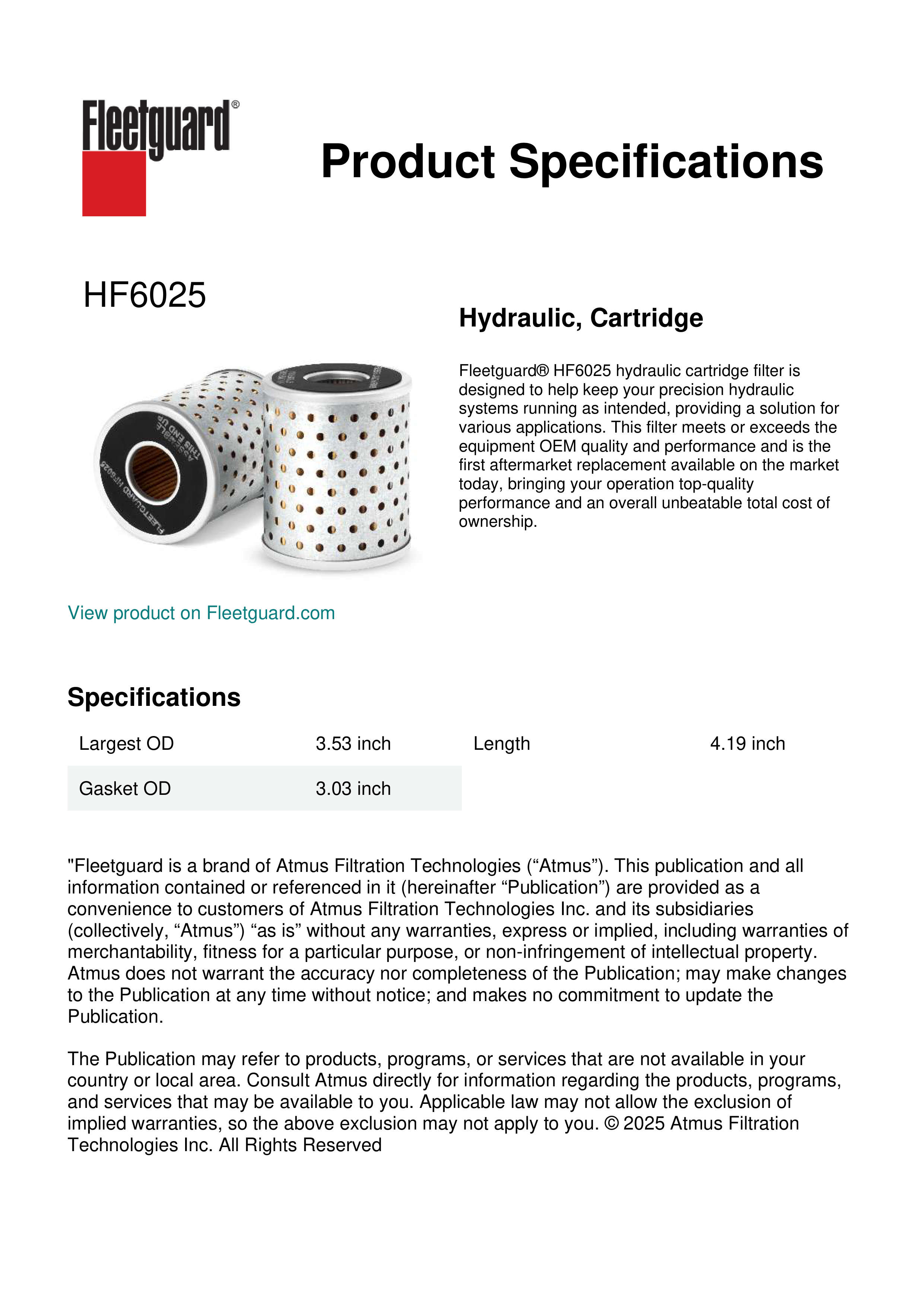 Fleetguard® HF6025 hydraulic cartridge filter is designed to help keep your precision hydraulic systems running as intended, providing a solution for various applications. This filter meets or exceeds the equipment OEM quality and performance and is the first aftermarket replacement available on the market today, bringing your operation top-quality performance and an overall unbeatable total cost of ownership.Specification