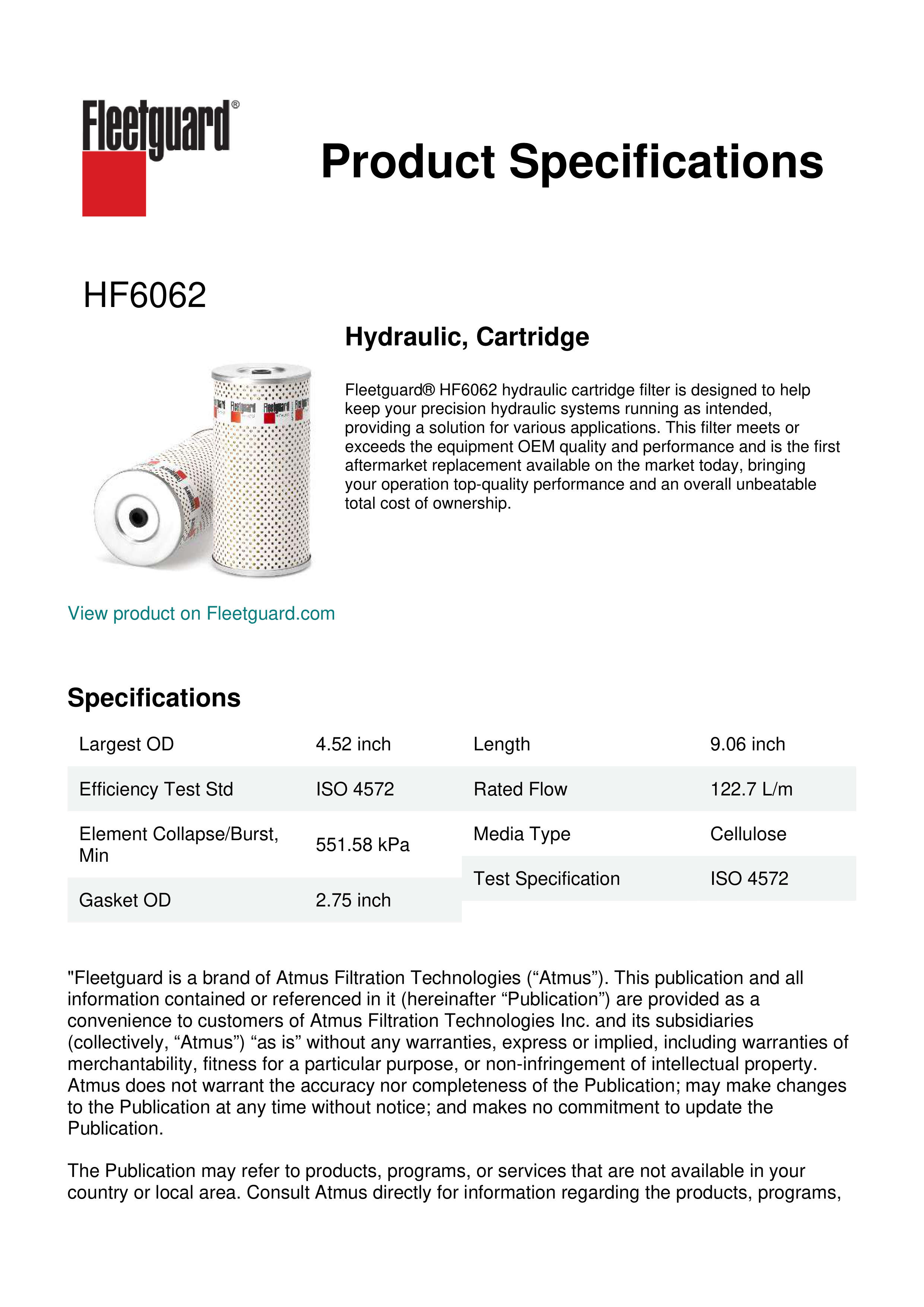 Fleetguard® HF6062 hydraulic cartridge filter is designed to help keep your precision hydraulic systems running as intended, providing a solution for various applications. This filter meets or exceeds the equipment OEM quality and performance and is the first aftermarket replacement available on the market today, bringing your operation top-quality performance and an overall unbeatable total cost of ownership.Specification