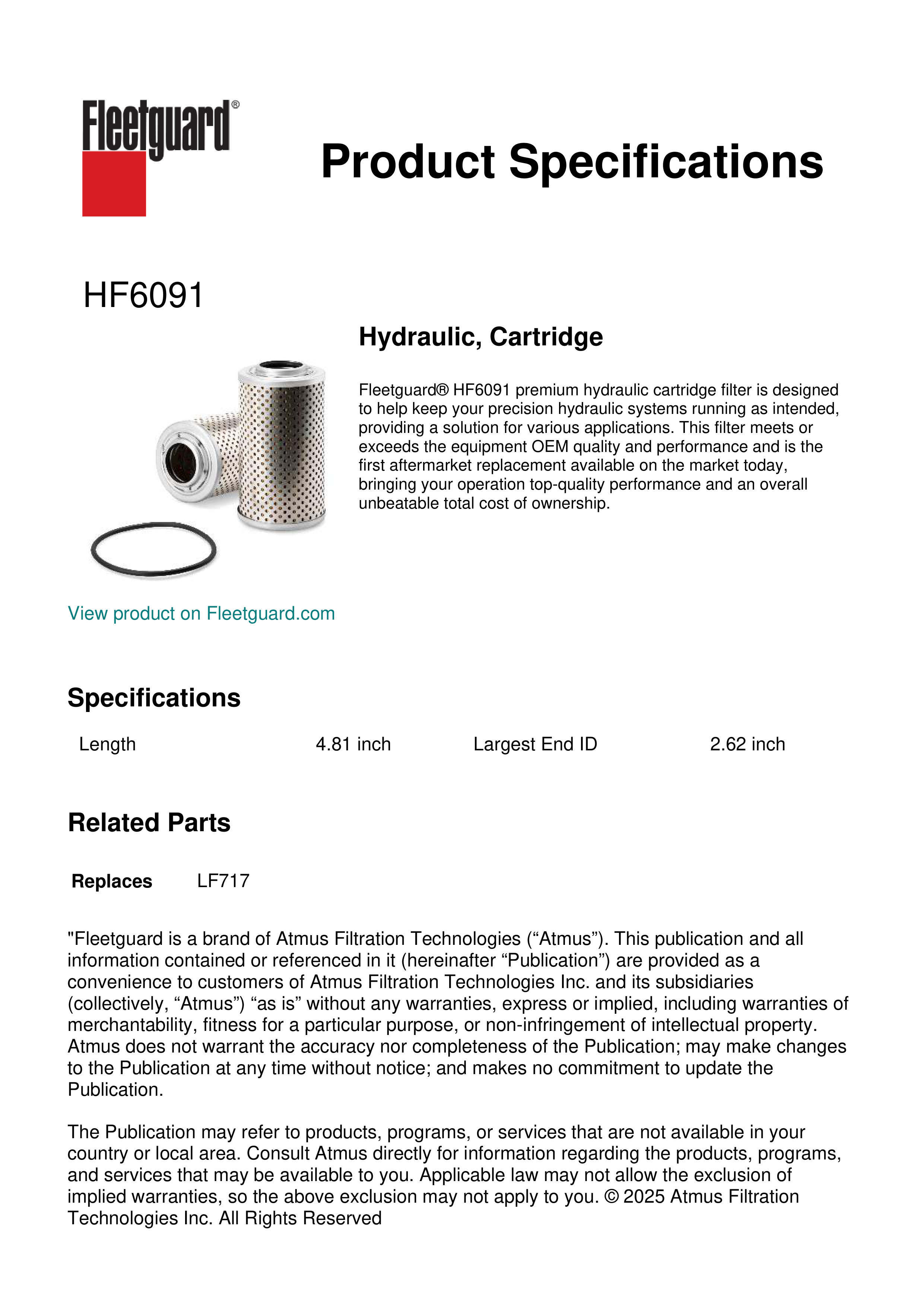 Fleetguard® HF6091 premium hydraulic cartridge filter is designed to help keep your precision hydraulic systems running as intended, providing a solution for various applications. This filter meets or exceeds the equipment OEM quality and performance and is the first aftermarket replacement available on the market today, bringing your operation top-quality performance and an overall unbeatable total cost of ownership.Specification