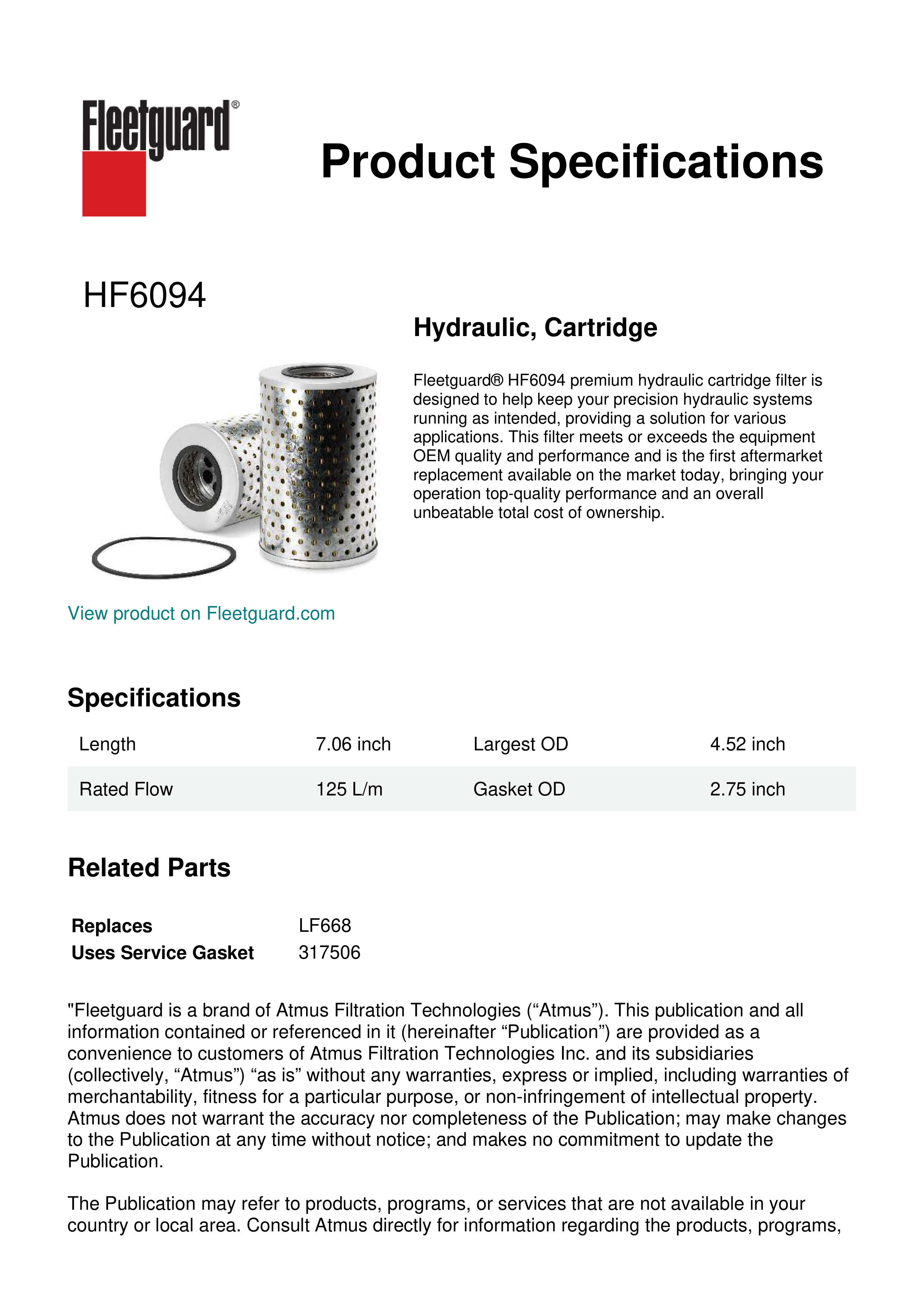 Fleetguard® HF6094 premium hydraulic cartridge filter is designed to help keep your precision hydraulic systems running as intended, providing a solution for various applications. This filter meets or exceeds the equipment OEM quality and performance and is the first aftermarket replacement available on the market today, bringing your operation top-quality performance and an overall unbeatable total cost of ownership.Specification