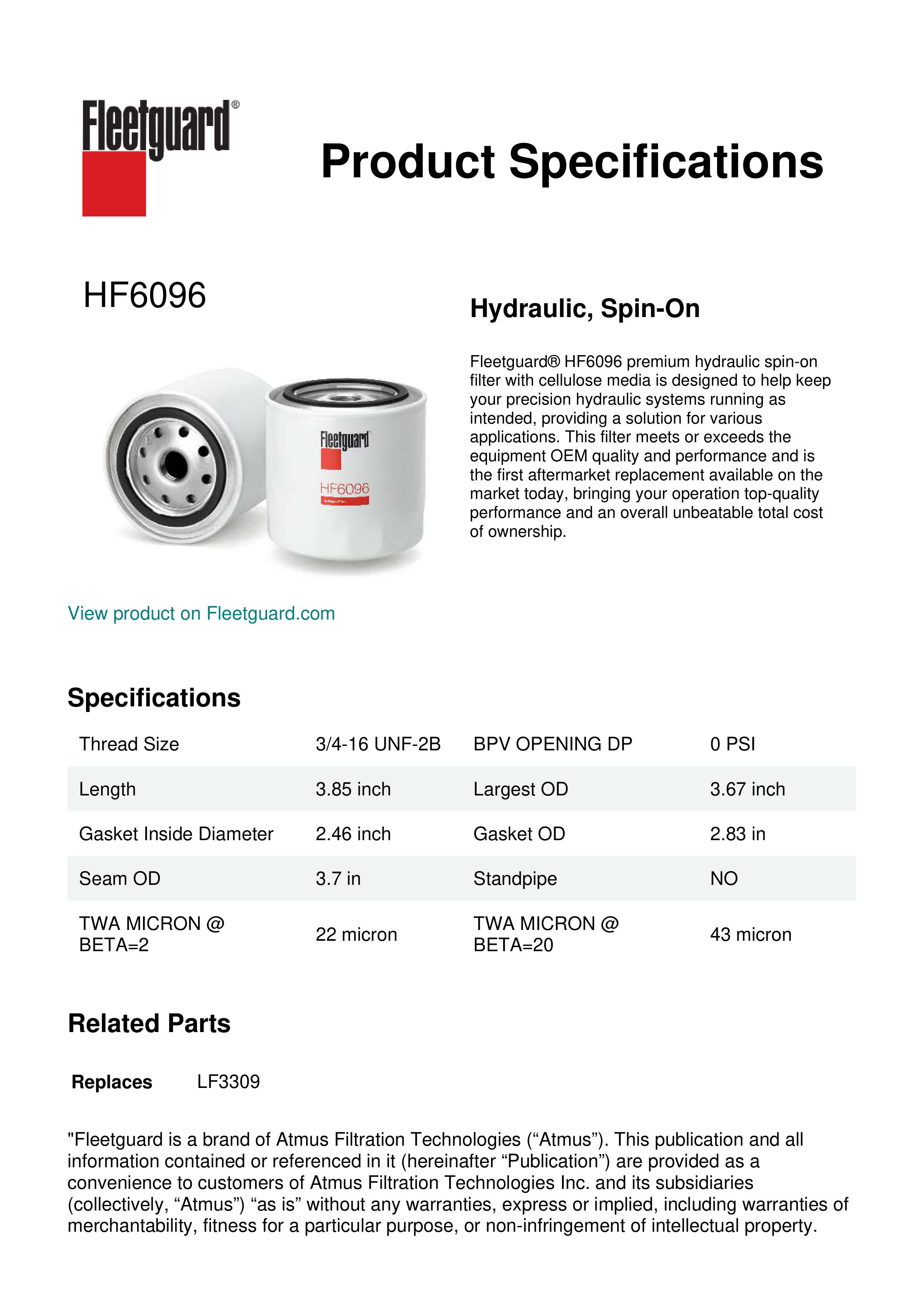 Fleetguard® HF6096 premium hydraulic spin-on filter with cellulose media is designed to help keep your precision hydraulic systems running as intended, providing a solution for various applications. This filter meets or exceeds the equipment OEM quality and performance and is the first aftermarket replacement available on the market today, bringing your operation top-quality performance and an overall unbeatable total cost of ownership.Specification