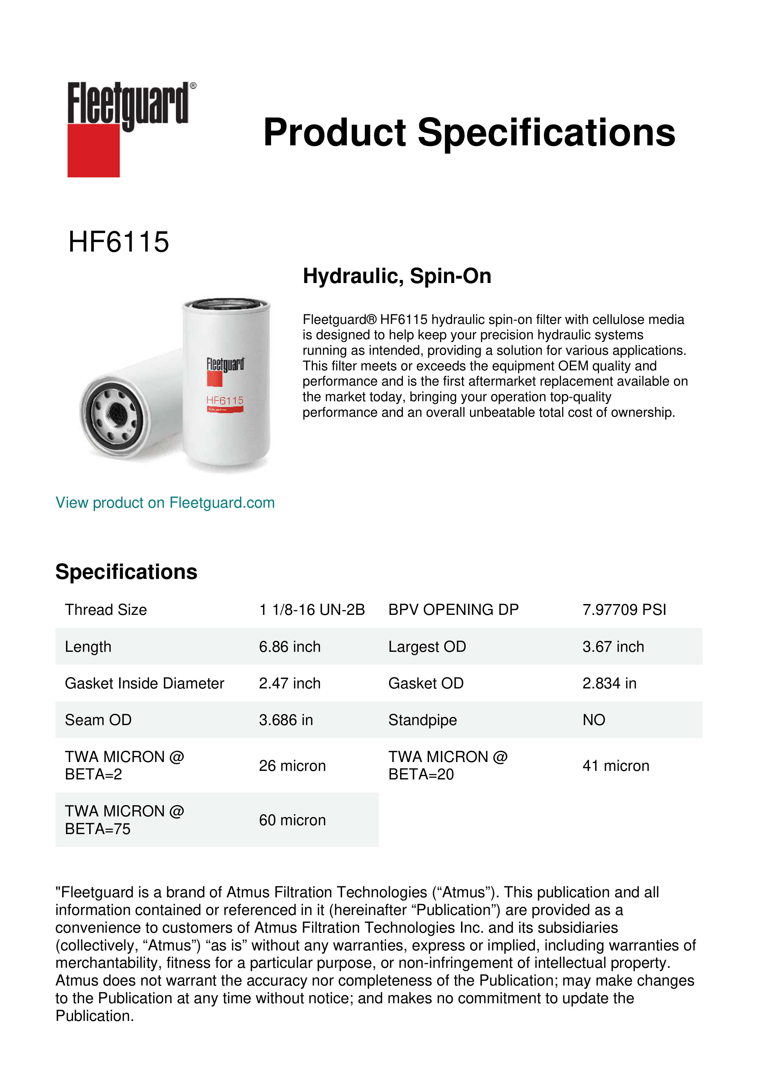 Fleetguard® HF6115 hydraulic spin-on filter with cellulose media is designed to help keep your precision hydraulic systems running as intended, providing a solution for various applications. This filter meets or exceeds the equipment OEM quality and performance and is the first aftermarket replacement available on the market today, bringing your operation top-quality performance and an overall unbeatable total cost of ownership.Specification