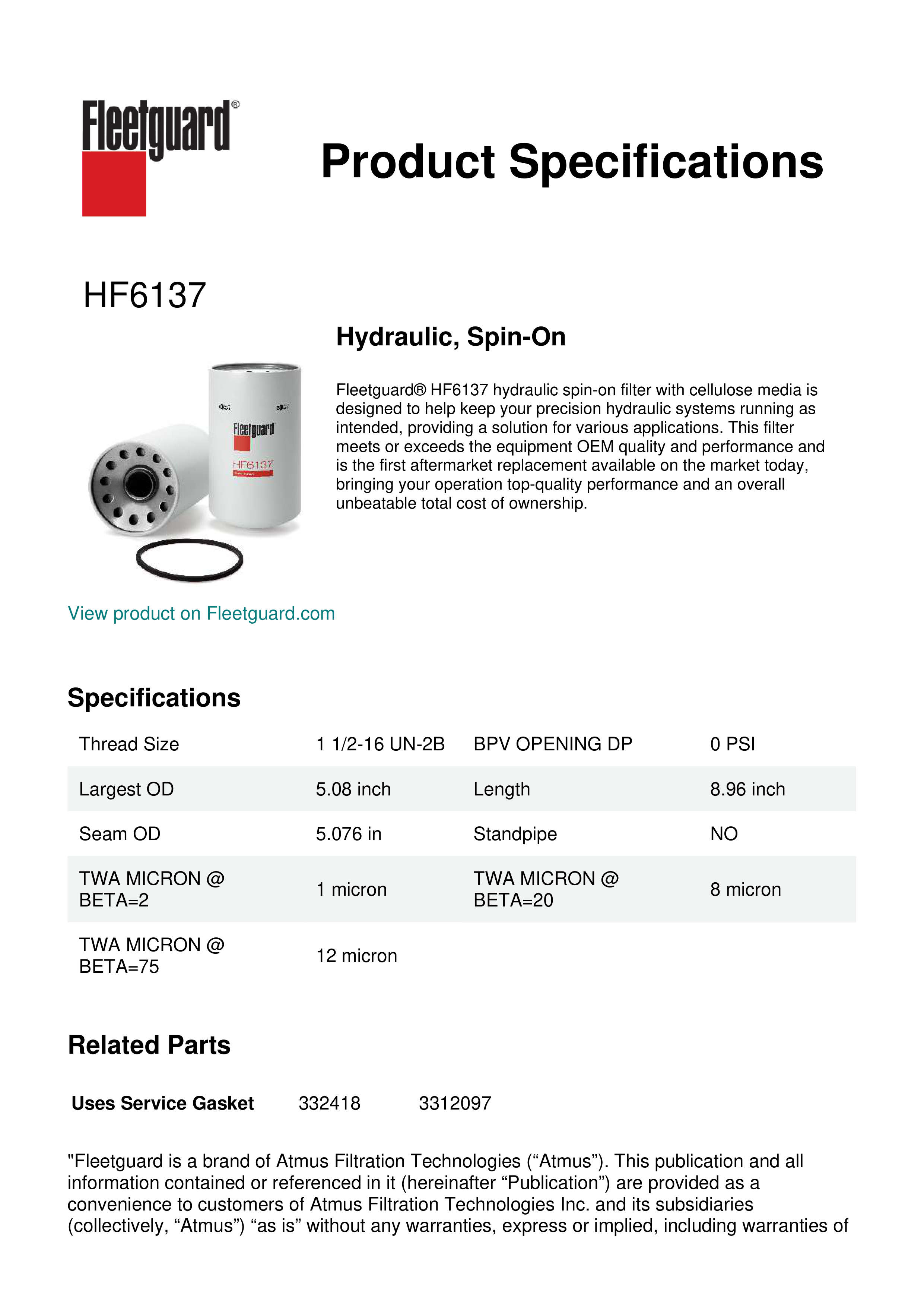 Fleetguard® HF6137 hydraulic spin-on filter with cellulose media is designed to help keep your precision hydraulic systems running as intended, providing a solution for various applications. This filter meets or exceeds the equipment OEM quality and performance and is the first aftermarket replacement available on the market today, bringing your operation top-quality performance and an overall unbeatable total cost of ownership.Specification
