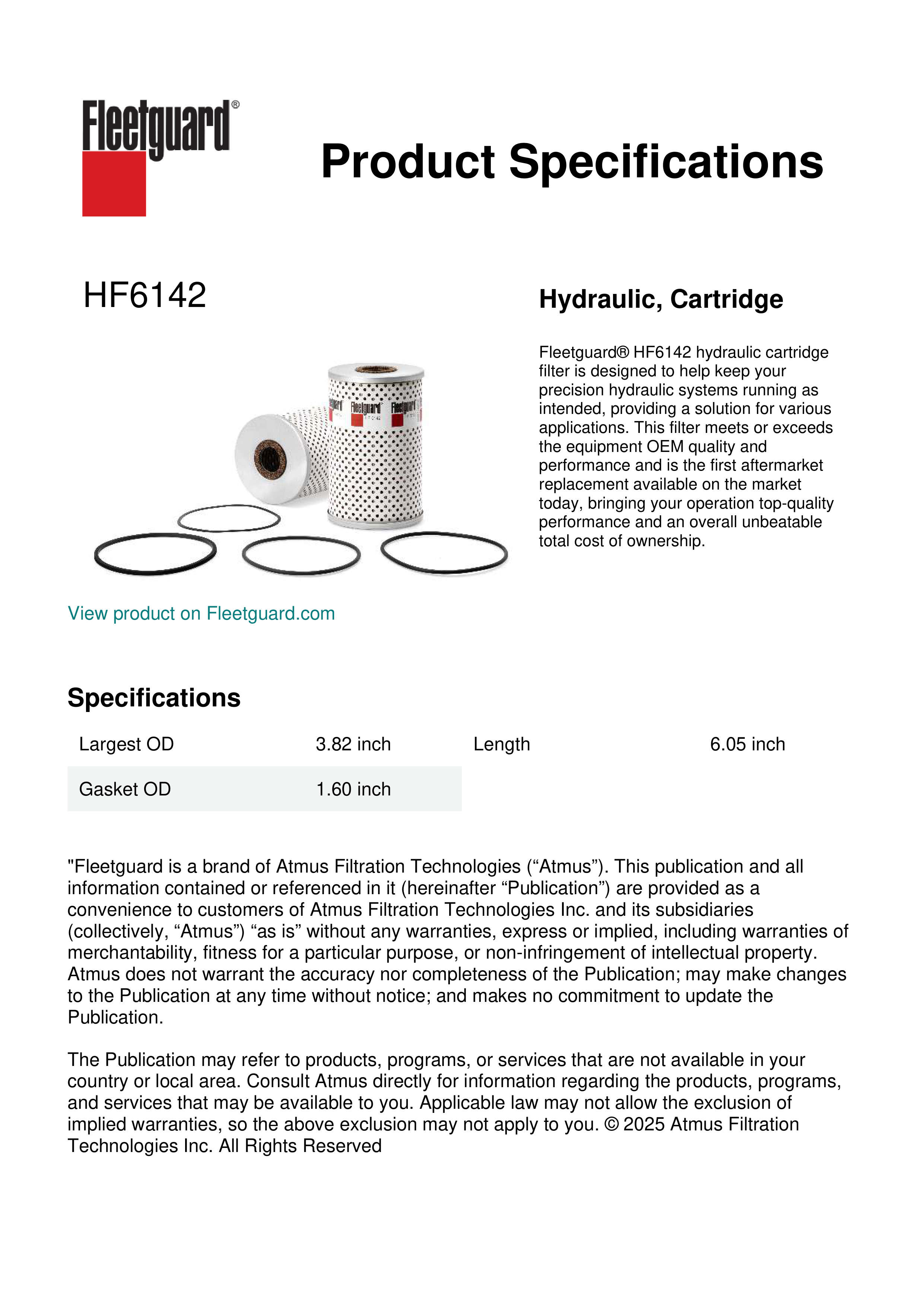 Fleetguard® HF6142 hydraulic cartridge filter is designed to help keep your precision hydraulic systems running as intended, providing a solution for various applications. This filter meets or exceeds the equipment OEM quality and performance and is the first aftermarket replacement available on the market today, bringing your operation top-quality performance and an overall unbeatable total cost of ownership.Specification