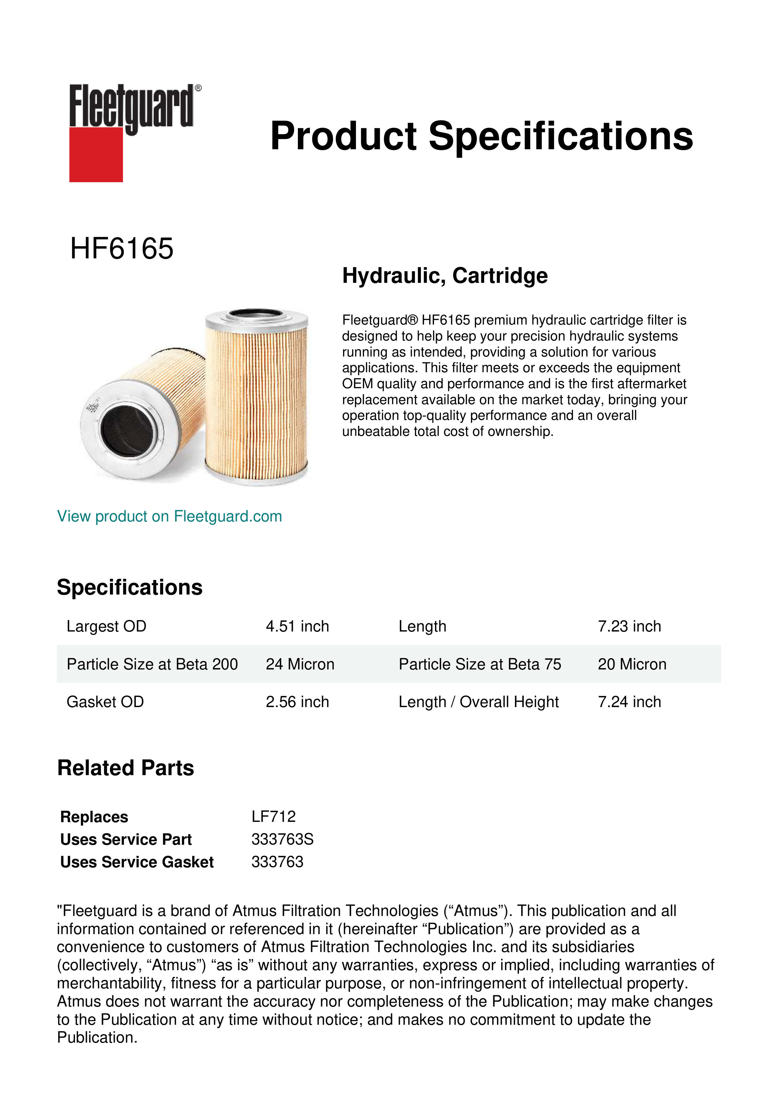 Fleetguard® HF6165 premium hydraulic cartridge filter is designed to help keep your precision hydraulic systems running as intended, providing a solution for various applications. This filter meets or exceeds the equipment OEM quality and performance and is the first aftermarket replacement available on the market today, bringing your operation top-quality performance and an overall unbeatable total cost of ownership.Specification