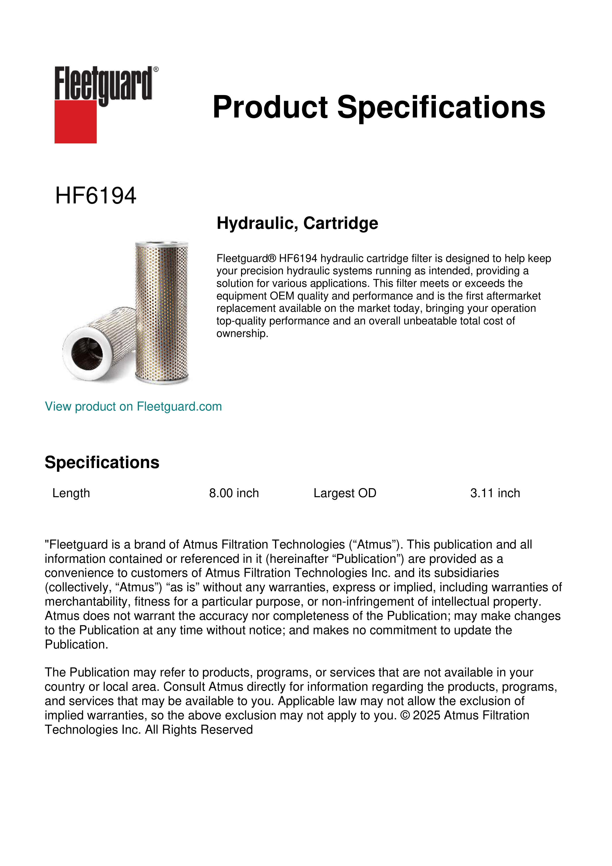Fleetguard® HF6194 hydraulic cartridge filter is designed to help keep your precision hydraulic systems running as intended, providing a solution for various applications. This filter meets or exceeds the equipment OEM quality and performance and is the first aftermarket replacement available on the market today, bringing your operation top-quality performance and an overall unbeatable total cost of ownership.Specification