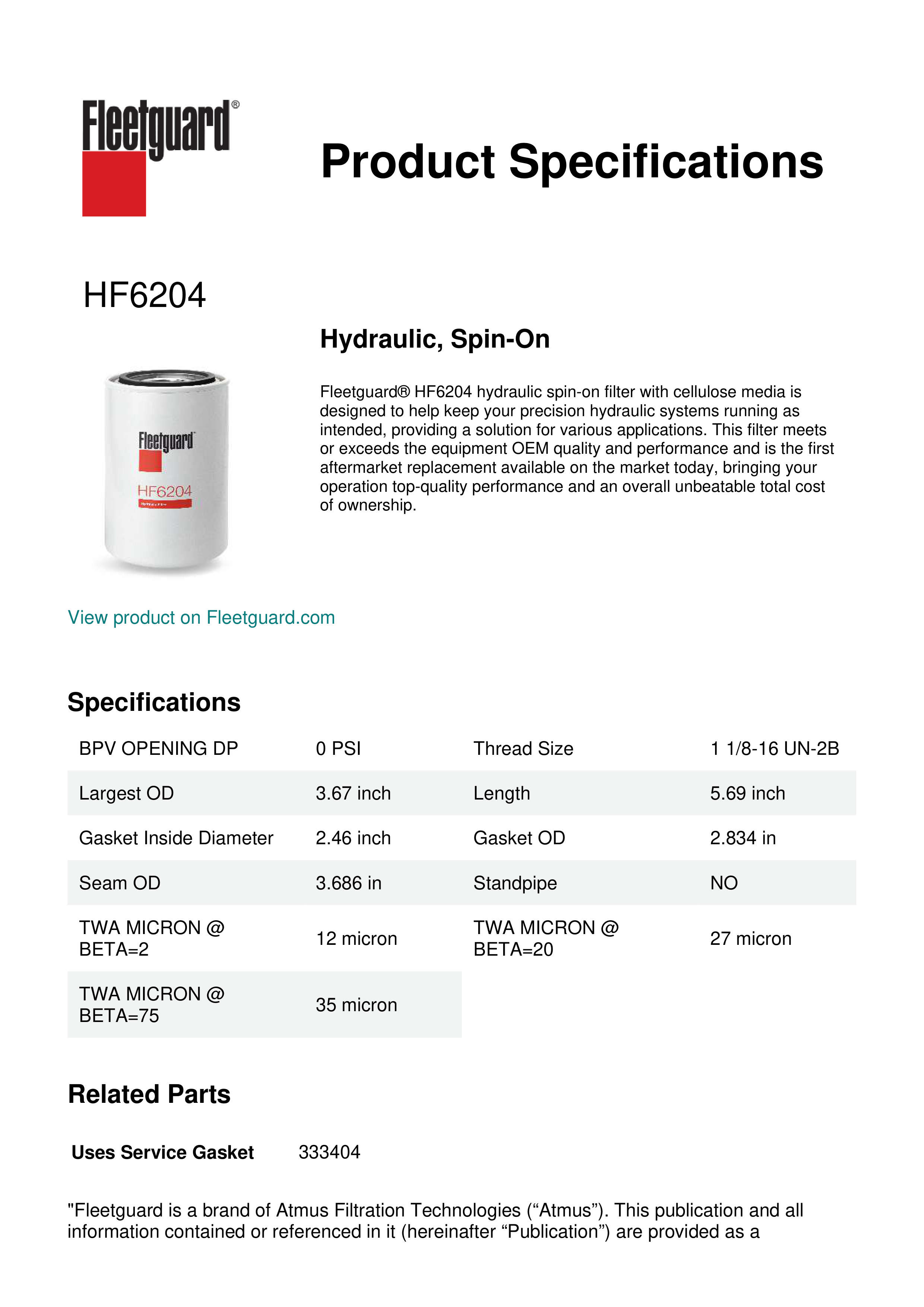 Fleetguard® HF6204 hydraulic spin-on filter with cellulose media is designed to help keep your precision hydraulic systems running as intended, providing a solution for various applications. This filter meets or exceeds the equipment OEM quality and performance and is the first aftermarket replacement available on the market today, bringing your operation top-quality performance and an overall unbeatable total cost of ownership.Specification