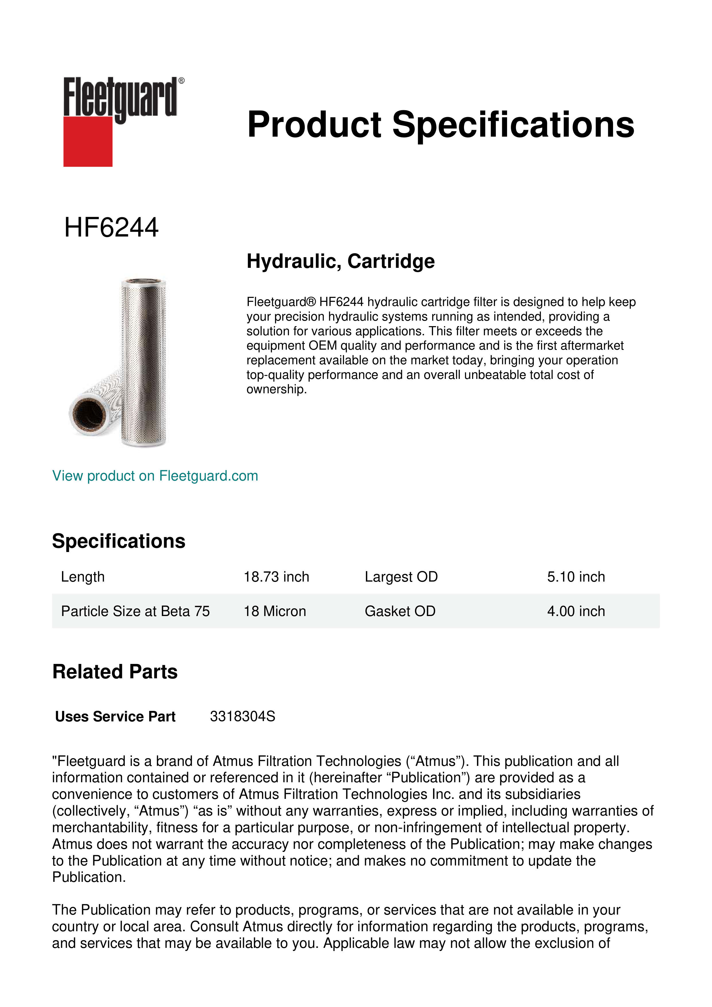 Fleetguard® HF6244 hydraulic cartridge filter is designed to help keep your precision hydraulic systems running as intended, providing a solution for various applications. This filter meets or exceeds the equipment OEM quality and performance and is the first aftermarket replacement available on the market today, bringing your operation top-quality performance and an overall unbeatable total cost of ownership.Specification