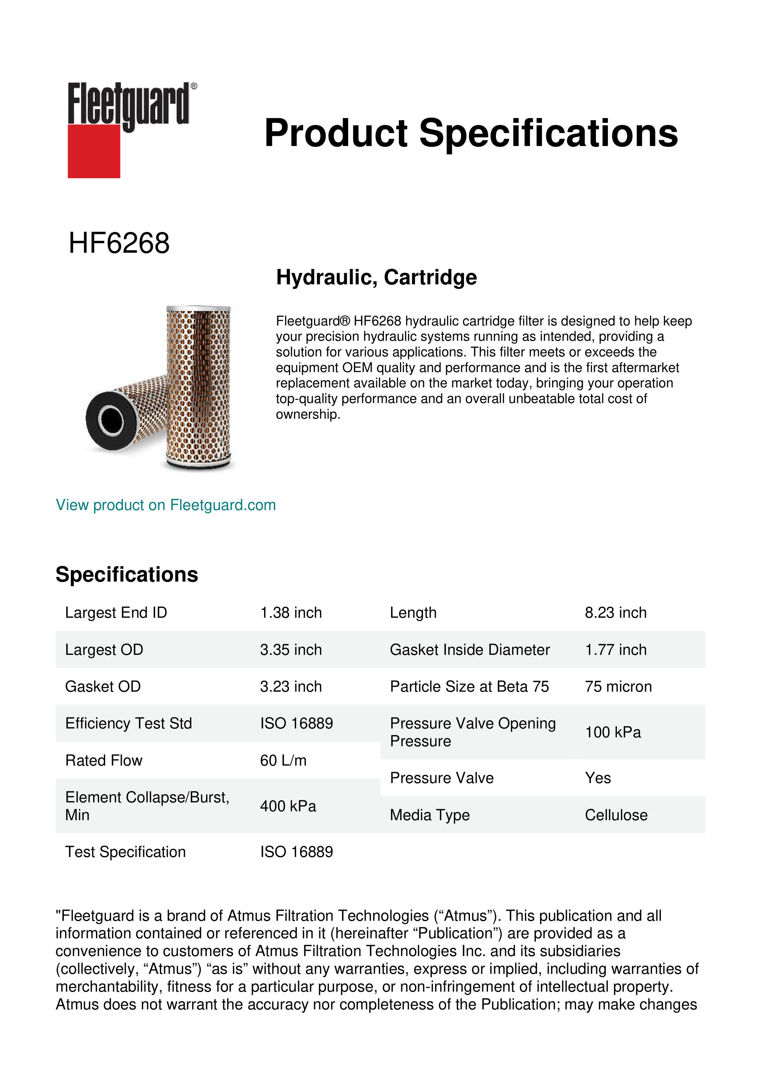 Fleetguard® HF6268 hydraulic cartridge filter is designed to help keep your precision hydraulic systems running as intended, providing a solution for various applications. This filter meets or exceeds the equipment OEM quality and performance and is the first aftermarket replacement available on the market today, bringing your operation top-quality performance and an overall unbeatable total cost of ownership.Specification