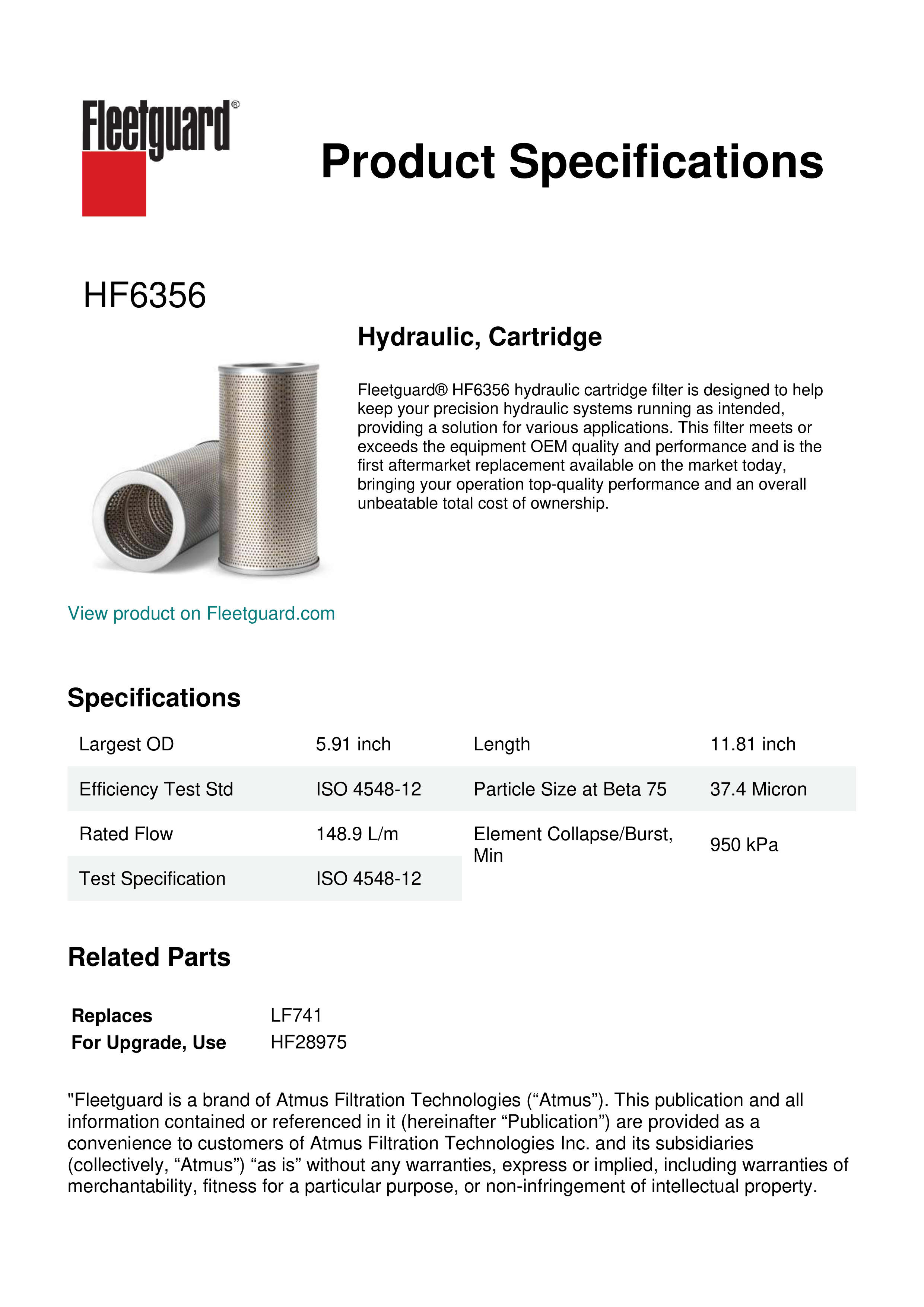 Fleetguard® HF6356 hydraulic cartridge filter is designed to help keep your precision hydraulic systems running as intended, providing a solution for various applications. This filter meets or exceeds the equipment OEM quality and performance and is the first aftermarket replacement available on the market today, bringing your operation top-quality performance and an overall unbeatable total cost of ownership.Specification