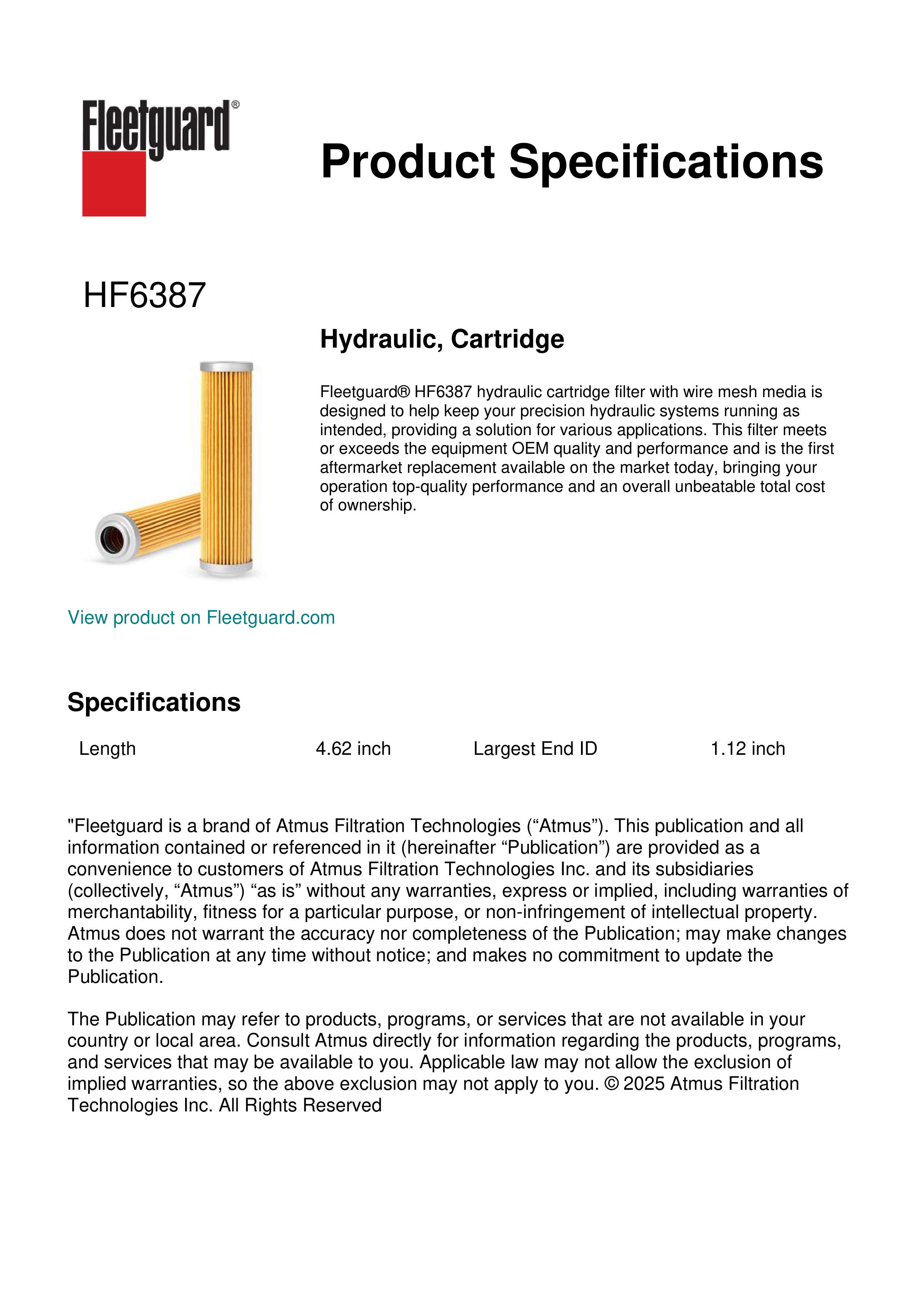 Fleetguard® HF6387 hydraulic cartridge filter with wire mesh media is designed to help keep your precision hydraulic systems running as intended, providing a solution for various applications. This filter meets or exceeds the equipment OEM quality and performance and is the first aftermarket replacement available on the market today, bringing your operation top-quality performance and an overall unbeatable total cost of ownership.Specification