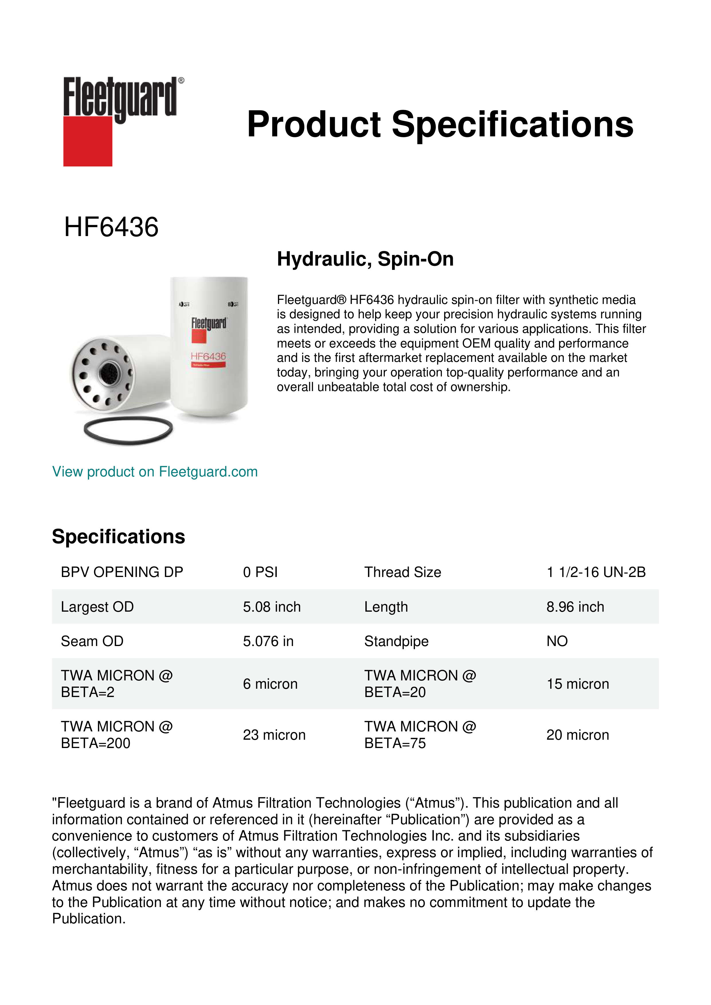 Fleetguard® HF6436 hydraulic spin-on filter with synthetic media is designed to help keep your precision hydraulic systems running as intended, providing a solution for various applications. This filter meets or exceeds the equipment OEM quality and performance and is the first aftermarket replacement available on the market today, bringing your operation top-quality performance and an overall unbeatable total cost of ownership.Specification