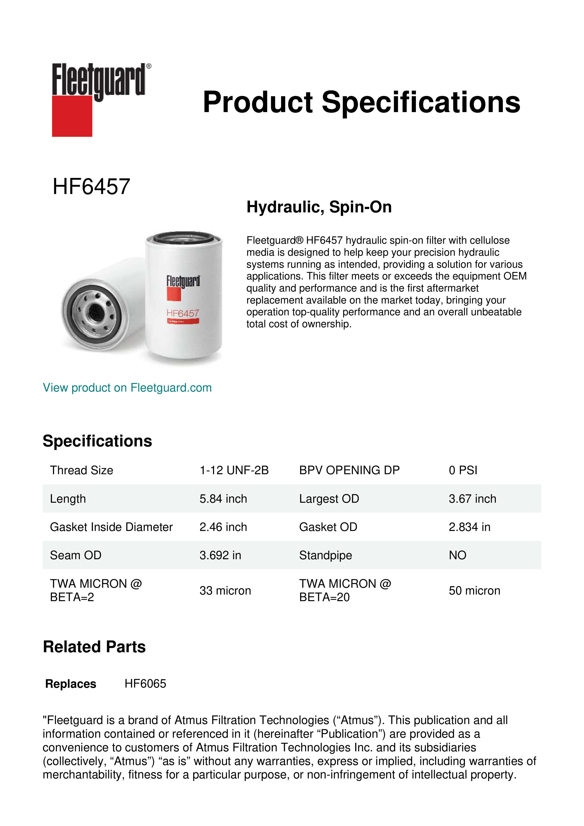 Fleetguard® HF6457 hydraulic spin-on filter with cellulose media is designed to help keep your precision hydraulic systems running as intended, providing a solution for various applications. This filter meets or exceeds the equipment OEM quality and performance and is the first aftermarket replacement available on the market today, bringing your operation top-quality performance and an overall unbeatable total cost of ownership.Specification