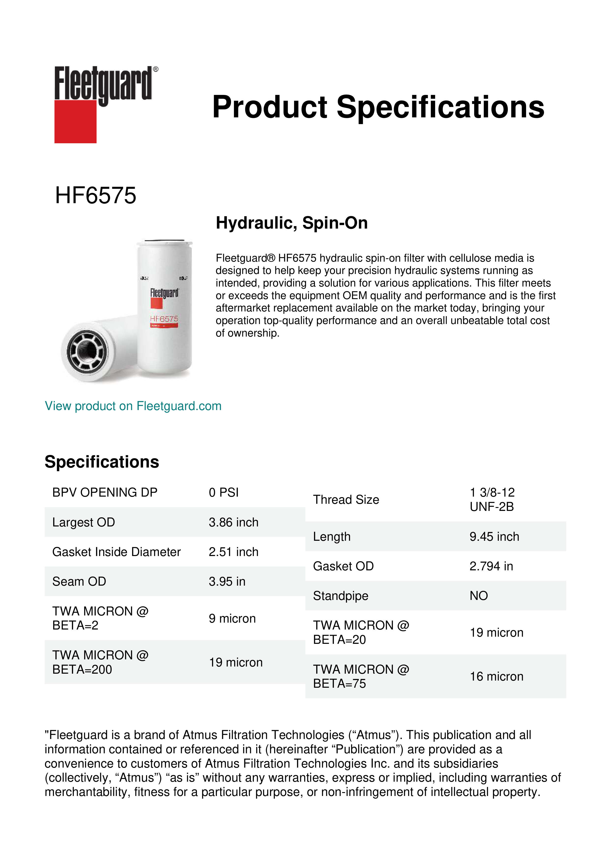 Fleetguard® HF6575 hydraulic spin-on filter with cellulose media is designed to help keep your precision hydraulic systems running as intended, providing a solution for various applications. This filter meets or exceeds the equipment OEM quality and performance and is the first aftermarket replacement available on the market today, bringing your operation top-quality performance and an overall unbeatable total cost of ownership.Specification
