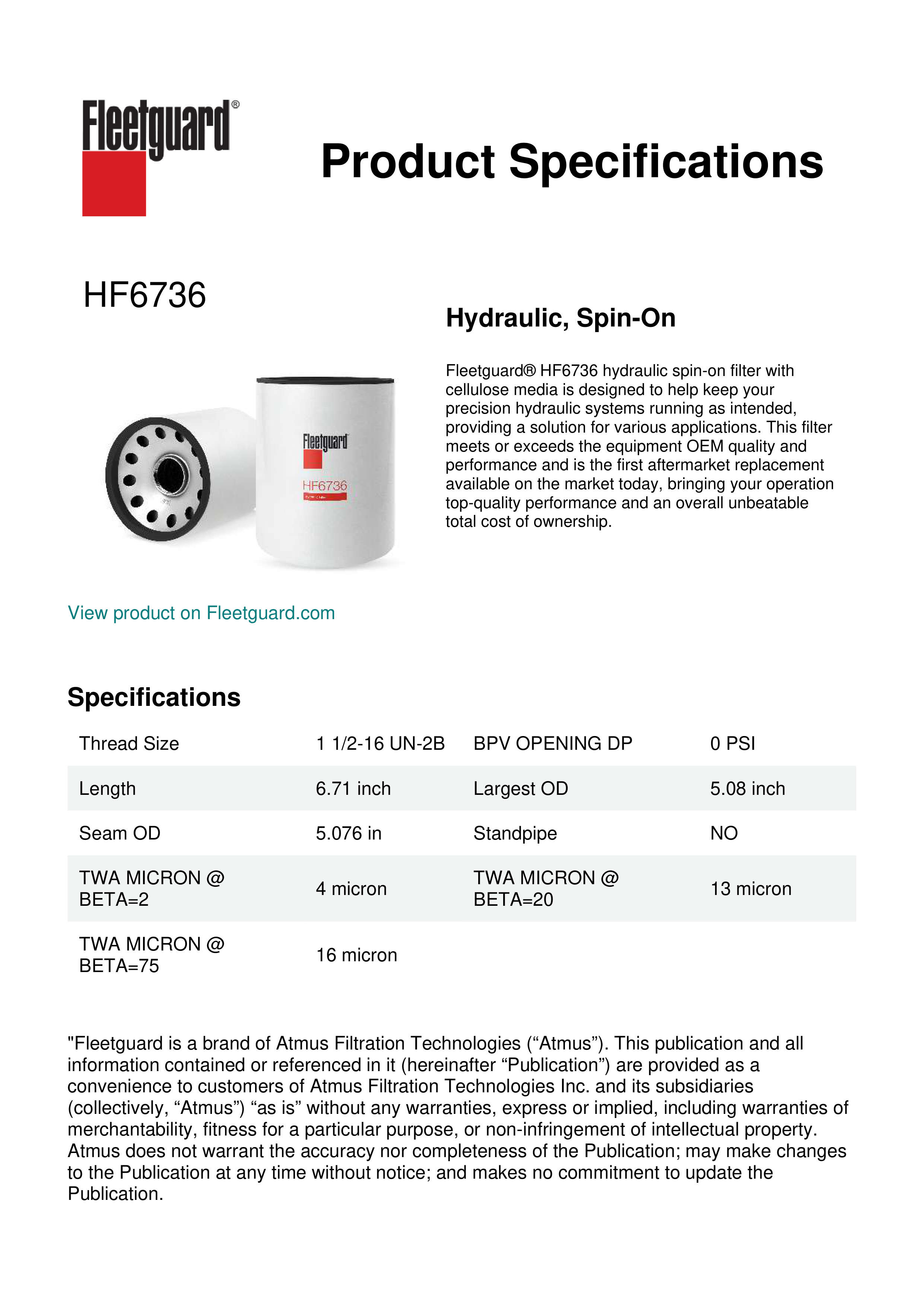 Fleetguard® HF6736 hydraulic spin-on filter with cellulose media is designed to help keep your precision hydraulic systems running as intended, providing a solution for various applications. This filter meets or exceeds the equipment OEM quality and performance and is the first aftermarket replacement available on the market today, bringing your operation top-quality performance and an overall unbeatable total cost of ownership.Specification