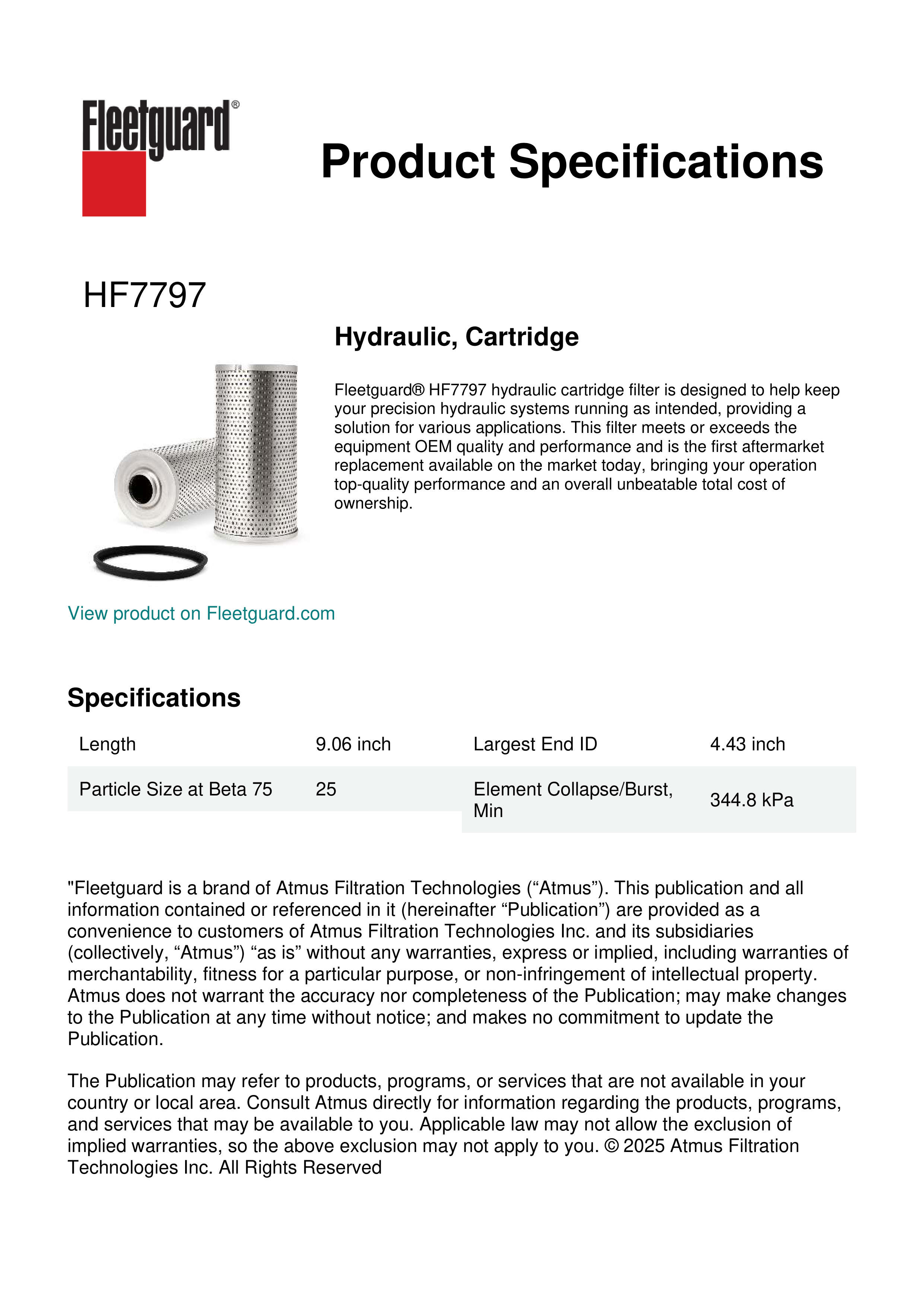 Fleetguard® HF7797 hydraulic cartridge filter is designed to help keep your precision hydraulic systems running as intended, providing a solution for various applications. This filter meets or exceeds the equipment OEM quality and performance and is the first aftermarket replacement available on the market today, bringing your operation top-quality performance and an overall unbeatable total cost of ownership.Specification